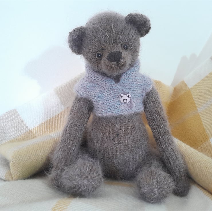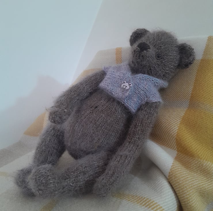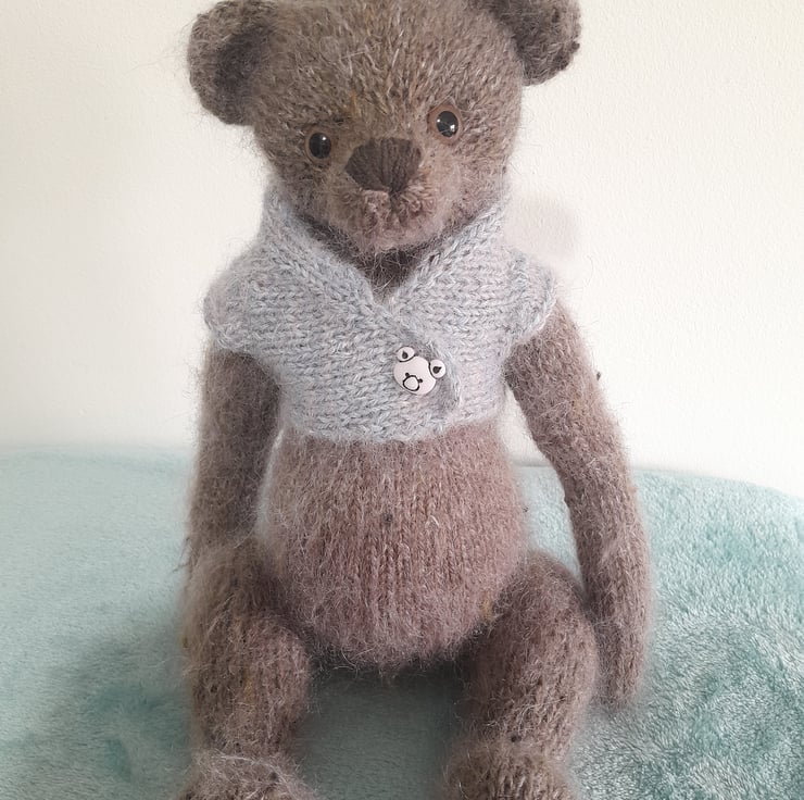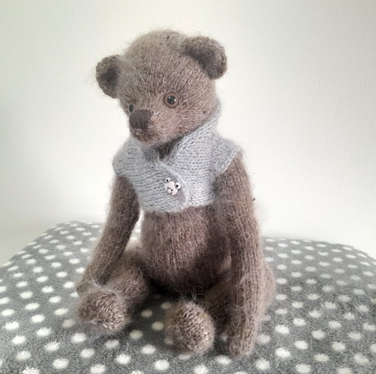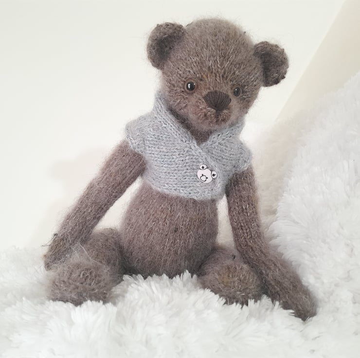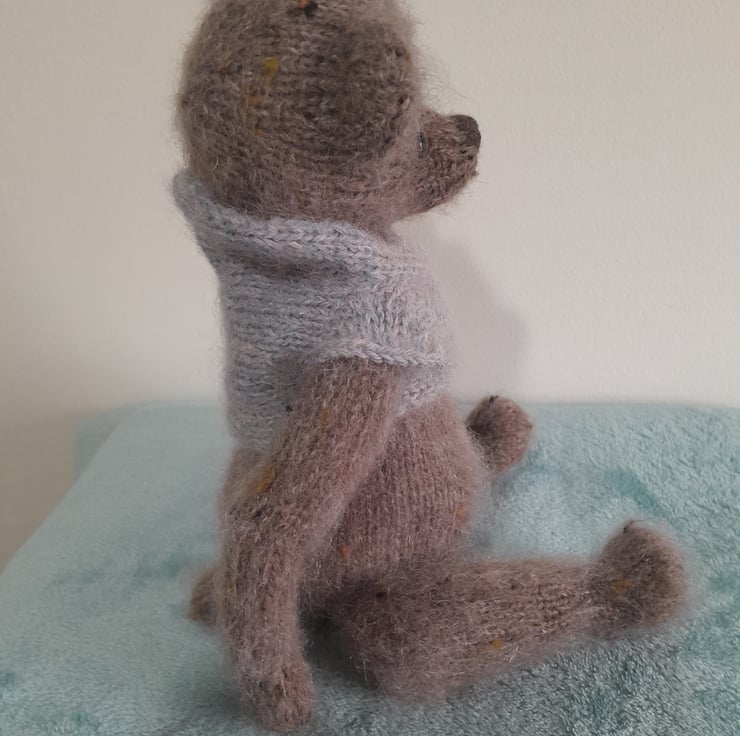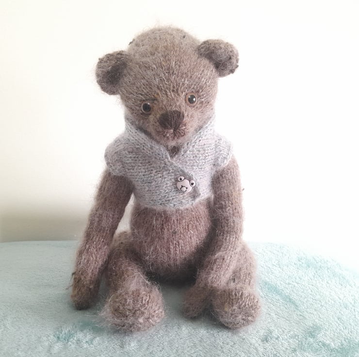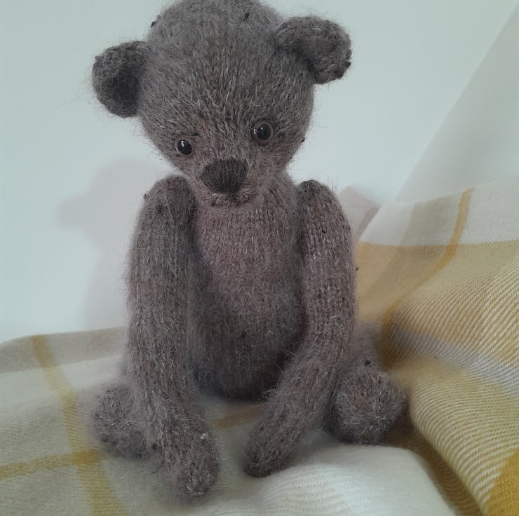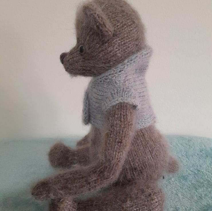 I've named this mohair bear Walnut. She measures 10" (25cm) sitting. Walnut is knitted in a combination of alpaca tweed yarn and kid mohair silk to create a traditional style of antique handmade bear. Her body is filled with a heavy stuffing and she has a dark chocolate brown hand embroidered nose to match her eyes.