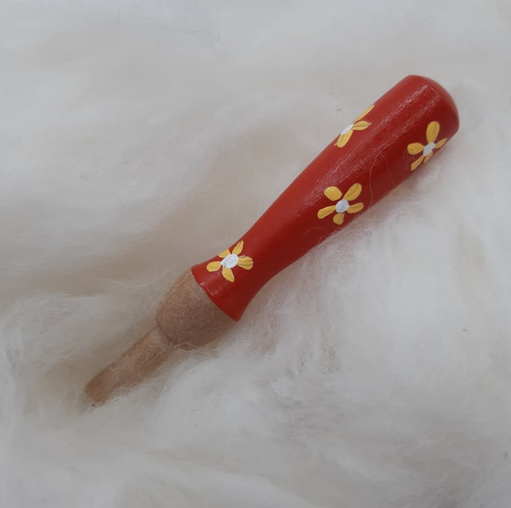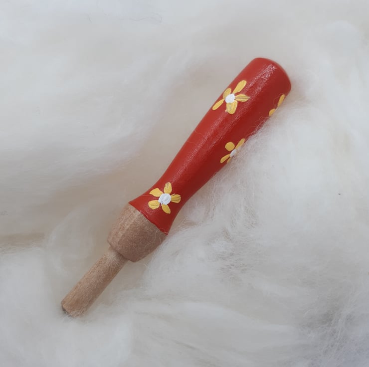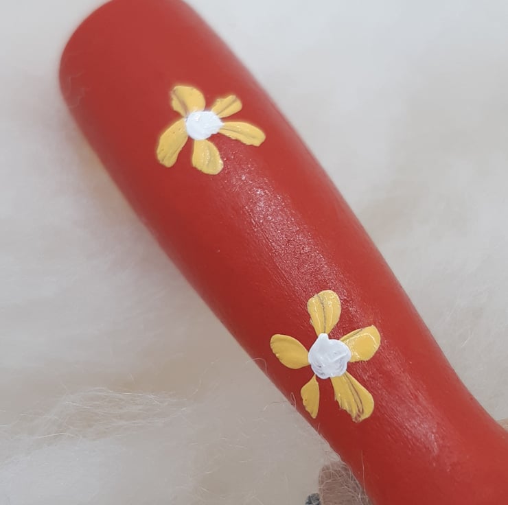 Hand painted, wooden needle grip holder for use with needle felting needles, painted in terracotta orange with small yellow and white around the handle. A perfect gift for your felting friends or as a treat for yourself.