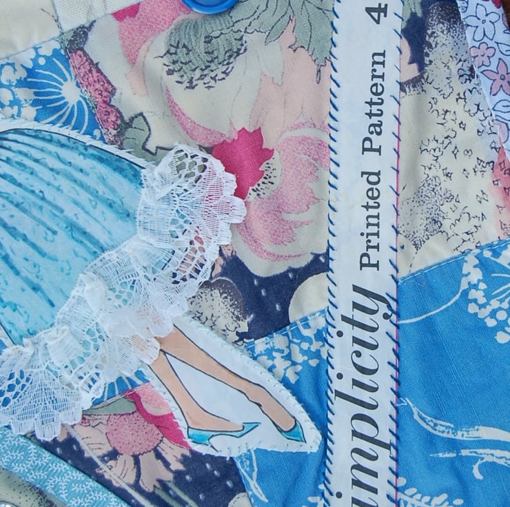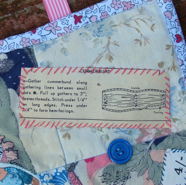 I found a lovely old Simplicity pattern for a 60s style cocktail dress. Amongst my selection of vintage fabric I had an old hand made patchwork cushion cover. The colours of the patchwork and one of the dresses on the pattern were just made for each other. I've hand the sewn the cutout dress, the Simplicity logo with price and a piece from the paper pattern showing how t make the cummerbund. I stitched hand stitched them onto the quilted fabric, added lace to the bottom of the cutout dress, a length of matching ribbon and a few buttons. I had stitched a piece of floral reclaimed fabric for the backing and edging. A few lengths of ribbon make hangers to hanging from a piece of dowel. A length of pink and white string finishes it to hang from your sewing room wall.