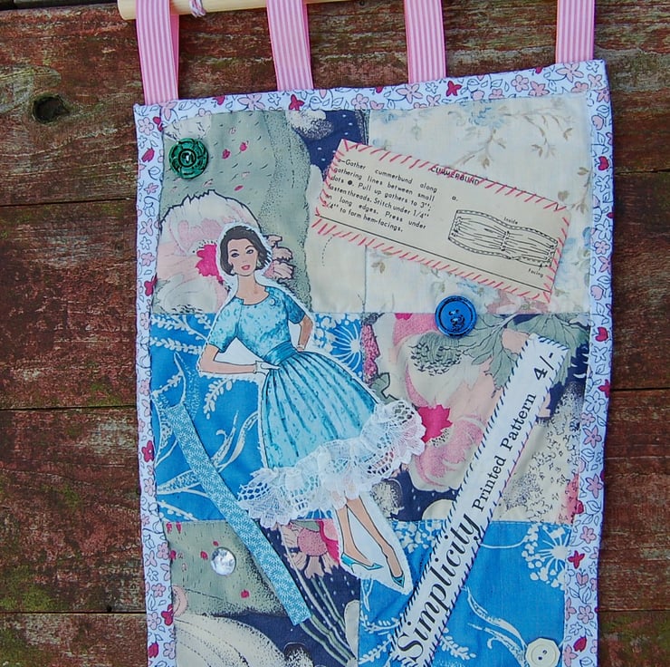 One of a kind sewing themed wall hanging created using a vintage Simplicity pattern and a piece of vintage patchwork. Backed and edged with reclaimed fabric.