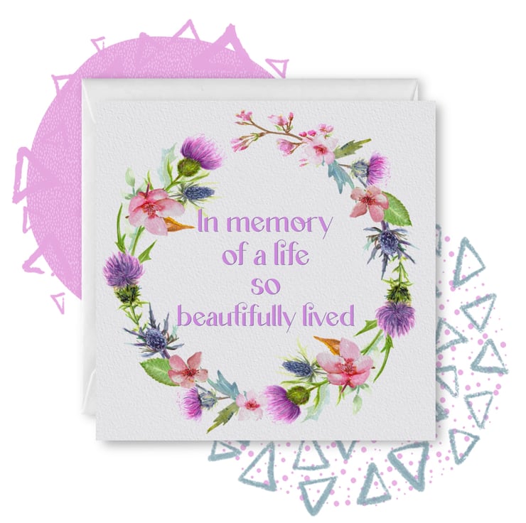A delicate watercolour thistle wreath with a beautiful sentiment celebrating the life of a friend or relative.