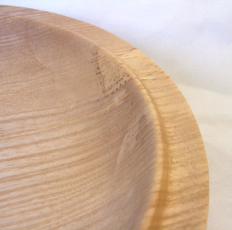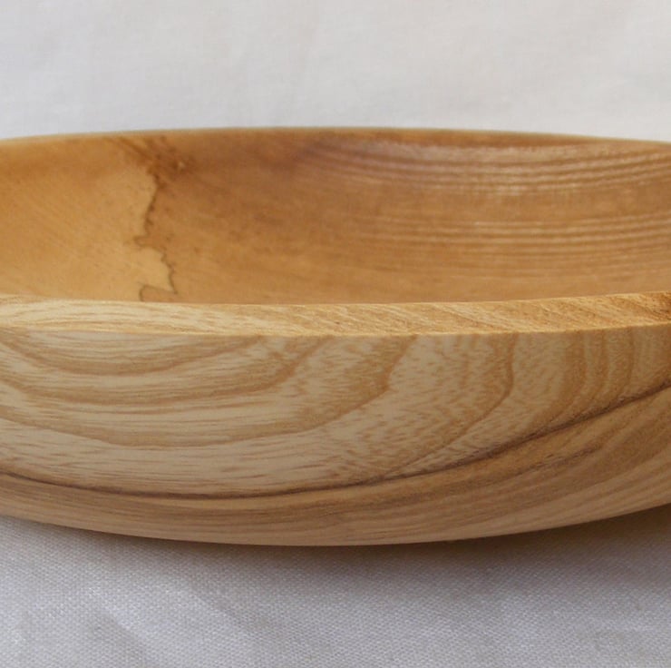 Spalted Ash Food, Salad or fruit bowl. 242 x 47mm (24.4 x 4.7cm) An ideal bowl for a variety of foods or for decoration. It is a piece of light grained Ash with an area of spalting and a darker streak down one side, the rim is in-sloped with a ridged bead on the inner edge. Food safe finish. Item 228