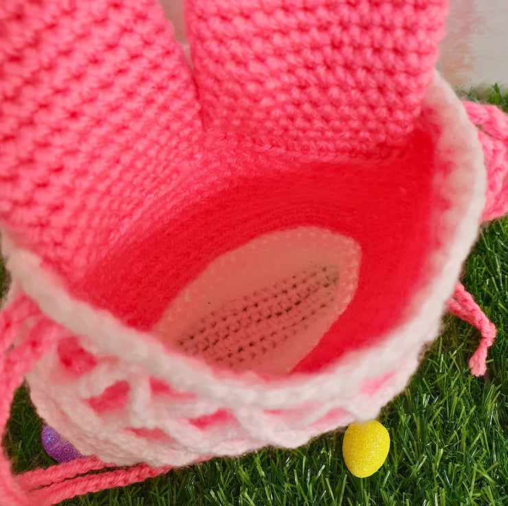 The main body of the pouch is pink, with white base and surrounded by an also white net. The bunny ears & both strings are also pink. The pouch measures approx. (W) 14cm x (H) 14.5cm without the ears, (H) 22.5cm with the ears.