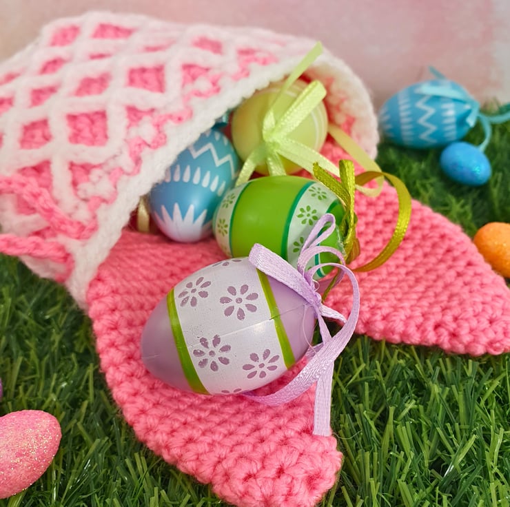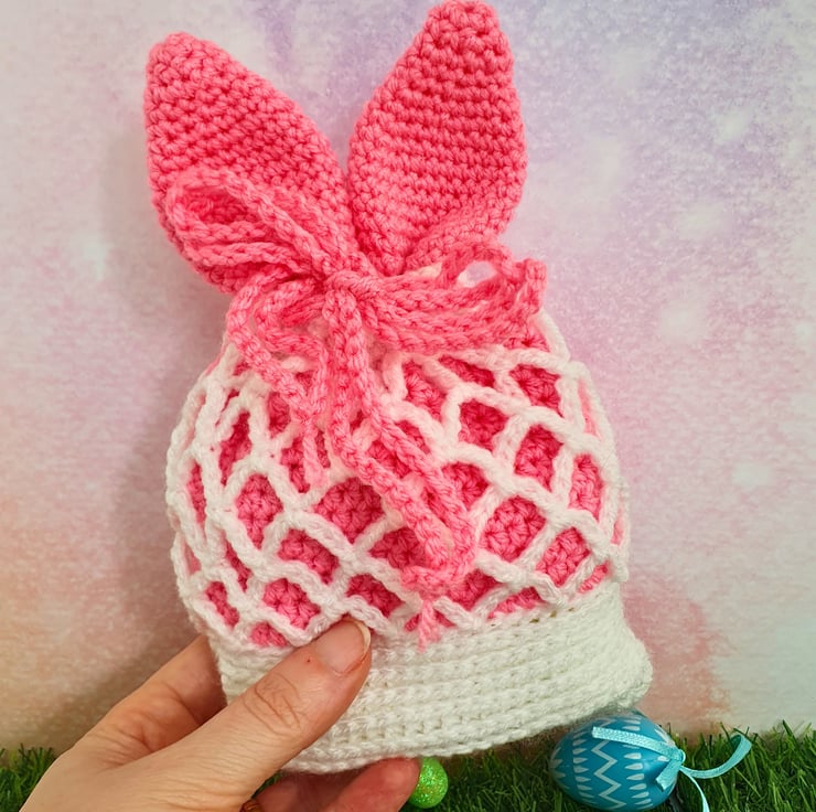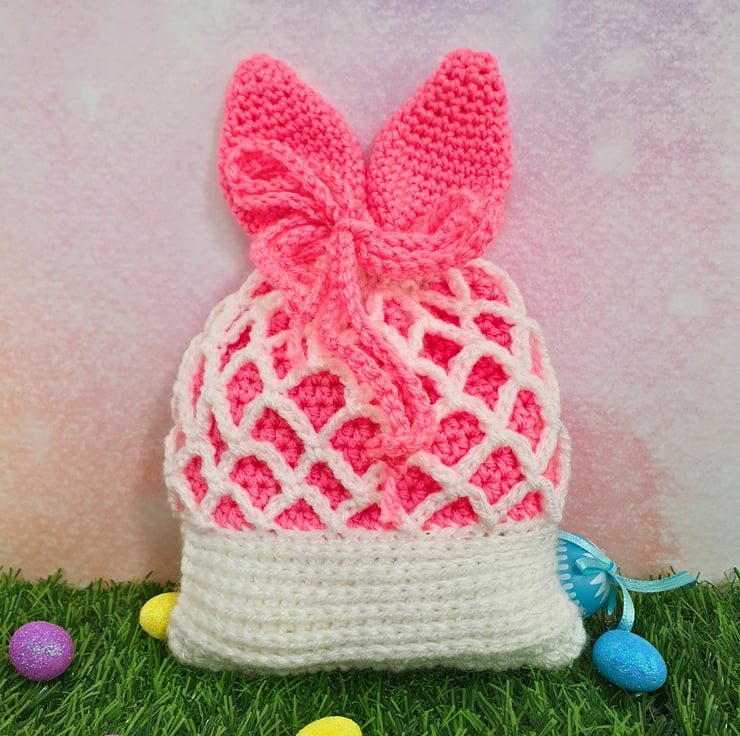 Drawstring treat pouch / gift bag with bunny ears, hand crocheted with a 100% acrylic yarn. The closure is made with 2 strings / cords, which when pulled in opposite directions, will keep your treats, small gifts & and, why not, Easter eggs, secure inside the pouch.