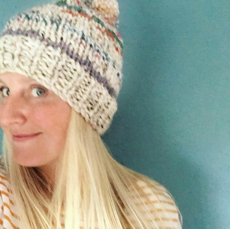A super chunky, wool blend hat with large pom pom. Designed and hand knitted by me, this soft hat will keep your noggin toasty.