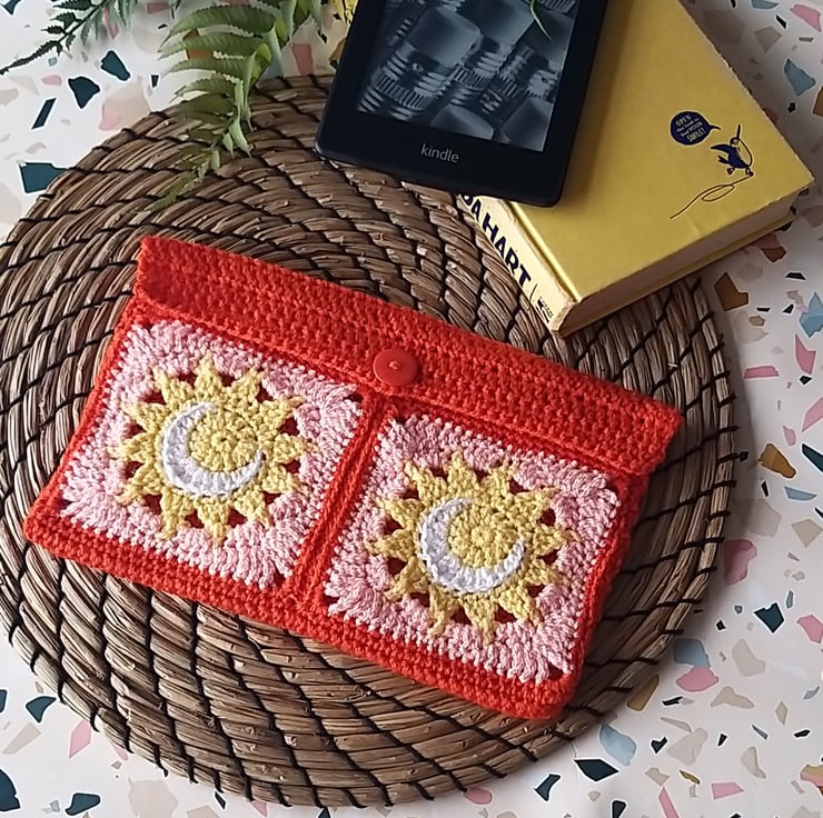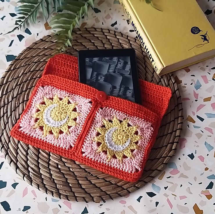 Crocheted in sunset shades of Orange and Apricot, featuring a crescent moon against a sun background.