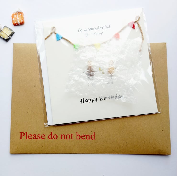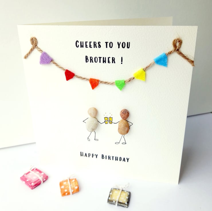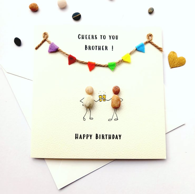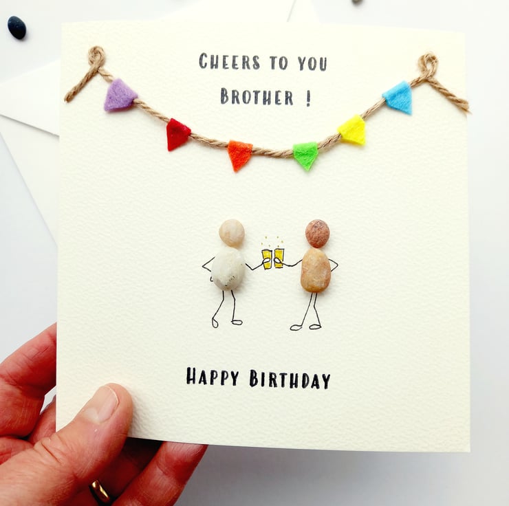 Raise a glass of beer or champagne with this birthday card featuring 2 pebble people toasting with glasses of golden bubbly under colourful bunting. This card is made to order and can be personalised for any friend or relative.