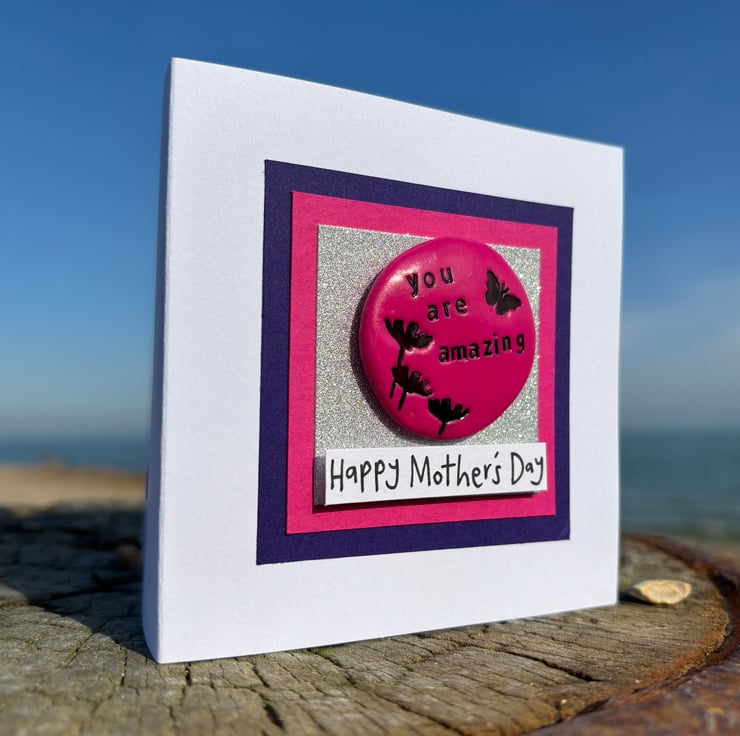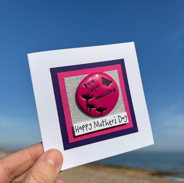 They measure approximately 3cm in diameter and .5cm in thickness, with each pebble being unique. I make them in small batches to keep them as alike each other as possible in that set. This pebble is attached with a sticky dot to the 5x5cm sparkling silver background and then mounted on a 6x6cm pink, then on a 7x7cm purple square to frame it beautifully. A Happy Mother’s Day message has been handwritten and stuck on with foam stickers to give it a slightly raised look for added quality. This can be changed to your own short message or chosen occasion (see examples photo). It has then been mounted on a 4x4 inch white 250gms card and comes with a 100gms white envelope. The inside of the card has a sticker to let the receiver know they can keep the pebble aspect of the card. The rest is blank for your own message.