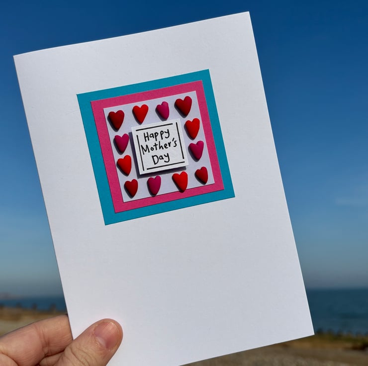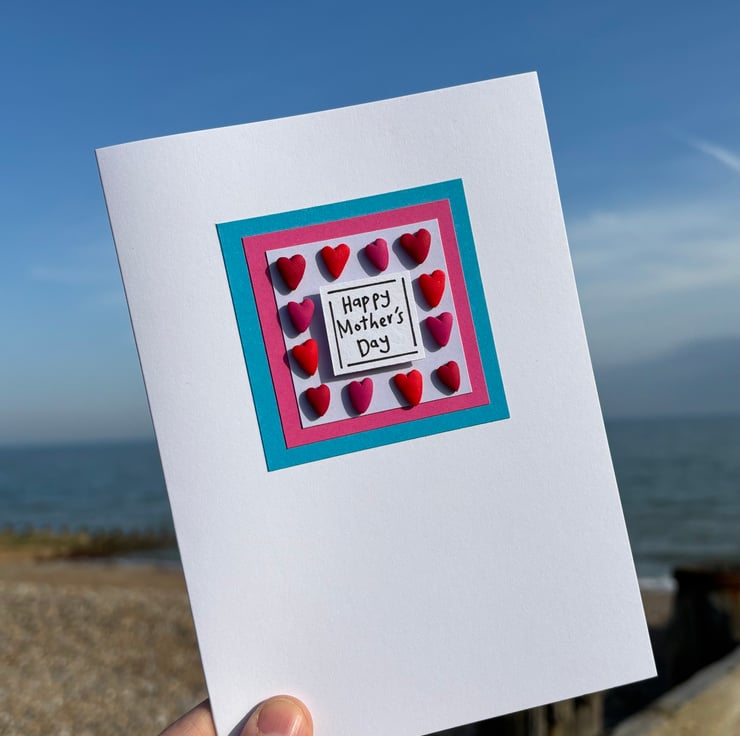 This vibrant tactile card is a mix of pink and red coloured hearts on a colourfulcard background. Each heart has been sculpted and baked by hand from polymer clay, so each varies slightly, but adds to the card’s unique charm. The colourful central design is 7x7cm.