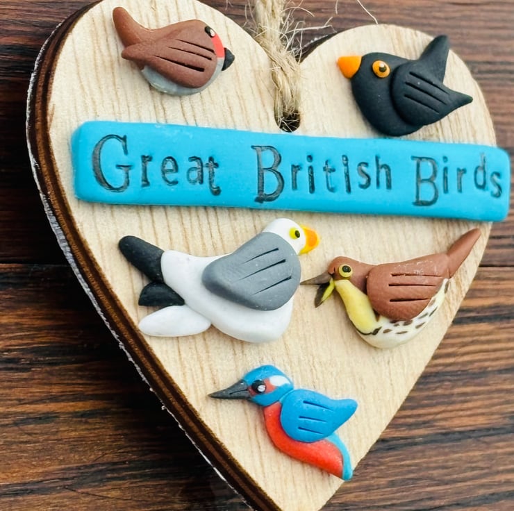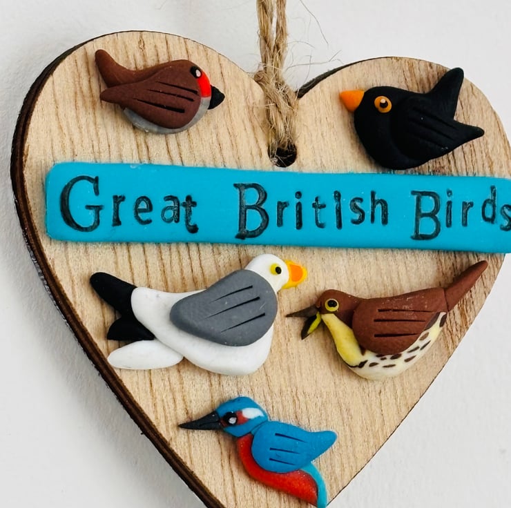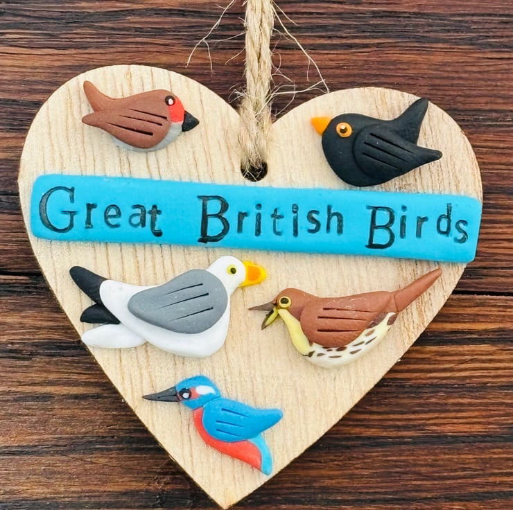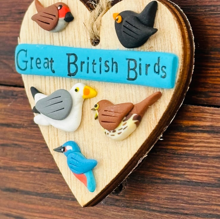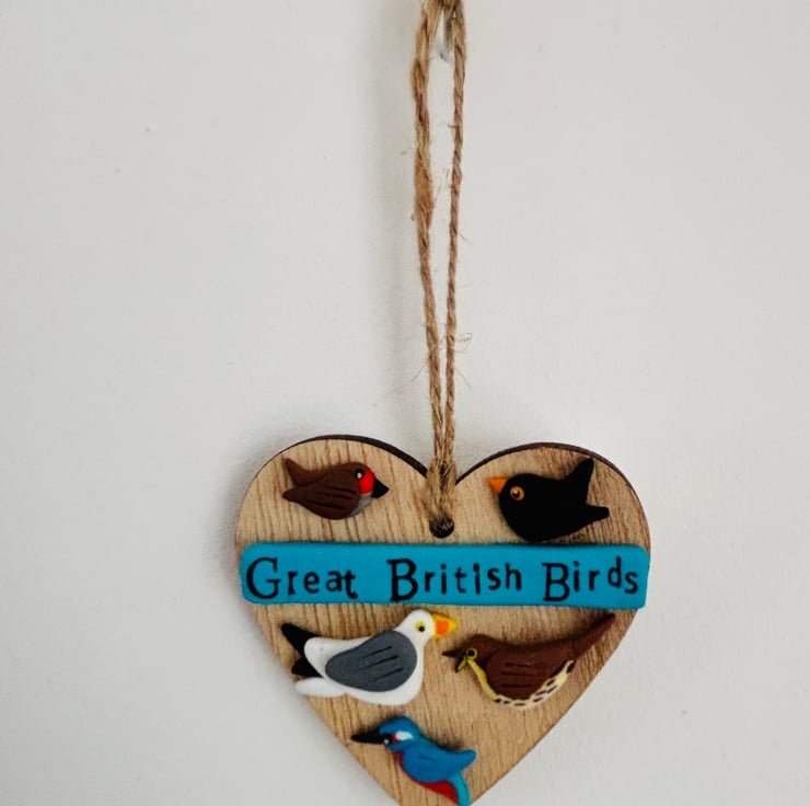 This hanging wall art decoration has 5 Great British birds mounted onto a wooden heart which is attached to twine to hang.