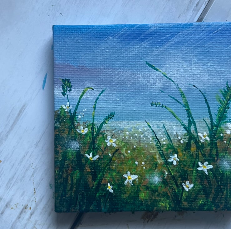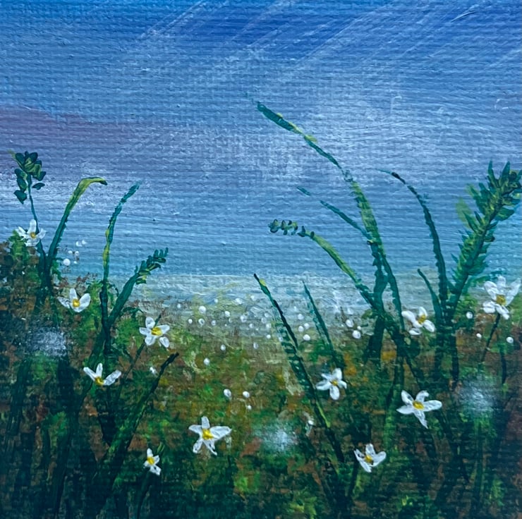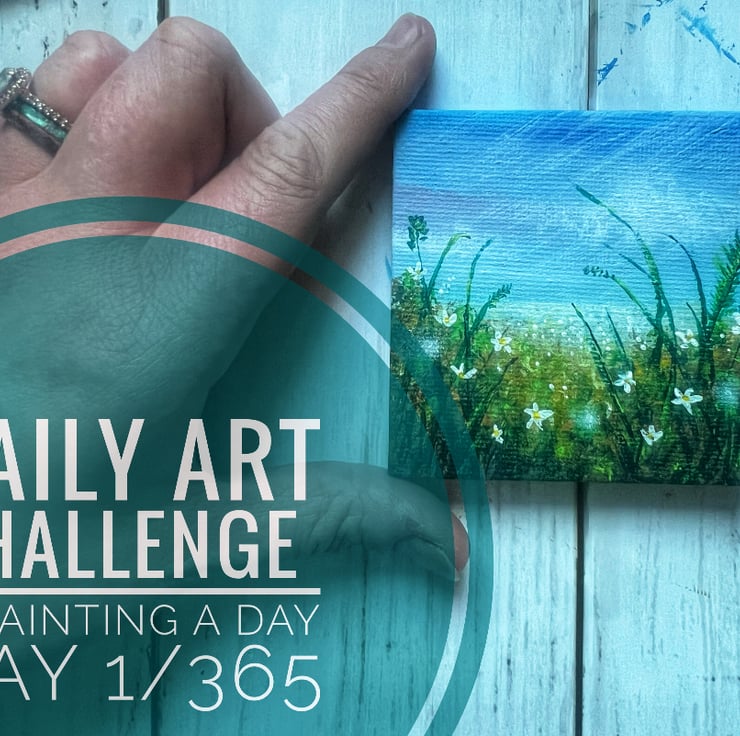 The journey begins! A painting a day for 365 days on a 7cm x 7cm mini canvas using acrylic paints. Today's piece is inspired by this morning’s dog walk, where I spotted the first early cherry blossoms peeking through the late winter forest. Painted intuitively, this tiny artwork captures a magical flower meadow, glowing with fairy orbs and delicate white flowers.