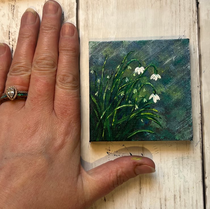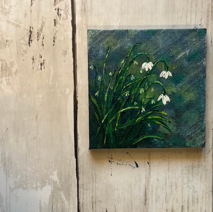 Today's mini 7cm x 7cm painting is inspired by the delicate beauty of snowdrops, a symbol of hope and the coming of spring. Using acrylic paints, I captured these tiny white blooms emerging through the last whispers of winter, bringing a touch of magic to the forest floor. Soft greens, gentle light, and a hint of fairy energy make this piece feel truly enchanting.
