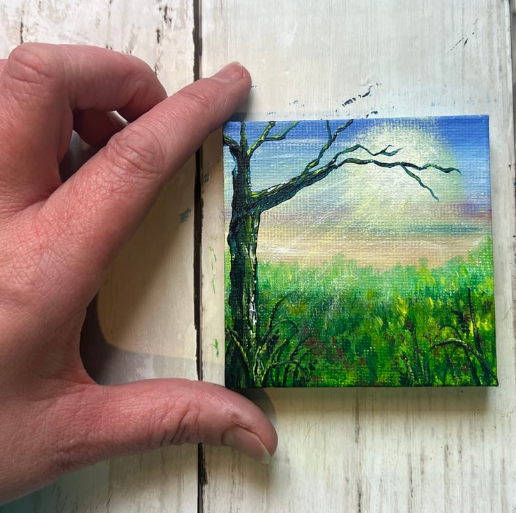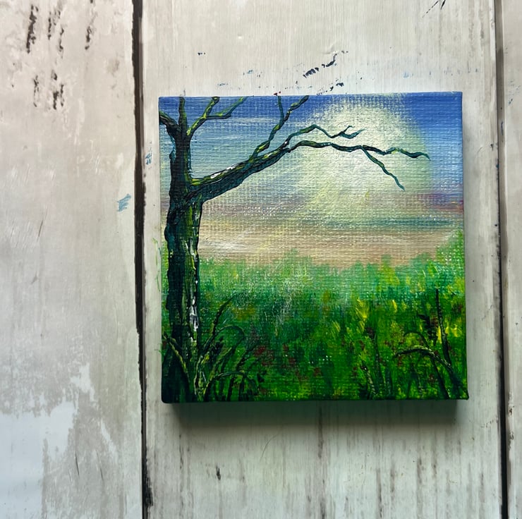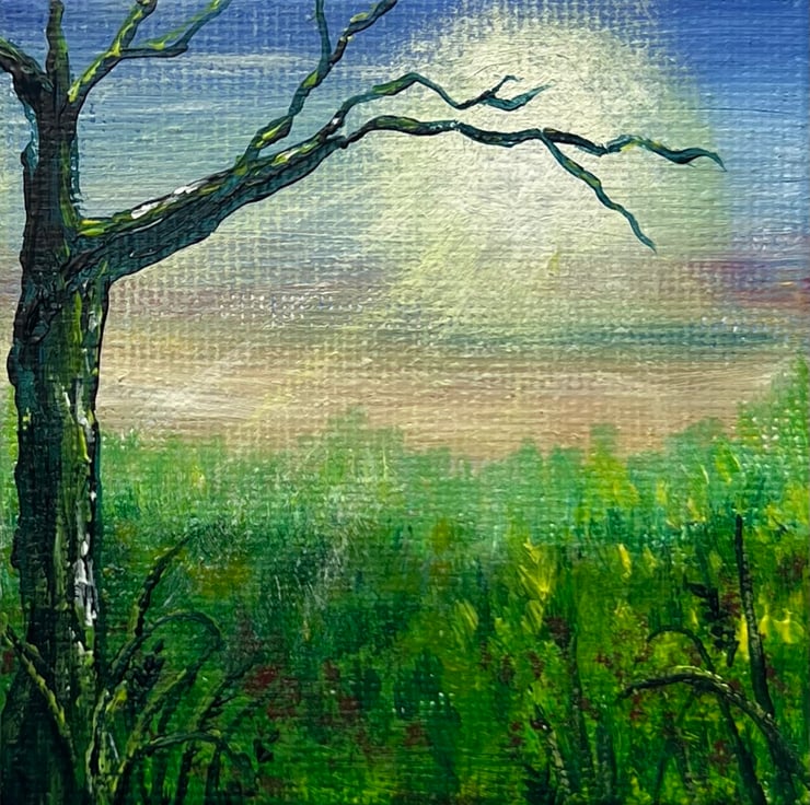 Today's mini 7cm x 7cm painting is inspired by the soft, hazy spring sun, its golden rays peeking through the trees and casting a beautiful silhouette. The fresh green grass glows beneath the light, full of new life and the promise of warmer days. Using acrylic paints, I captured this peaceful, magical moment—where nature awakens and light dances through the air.
