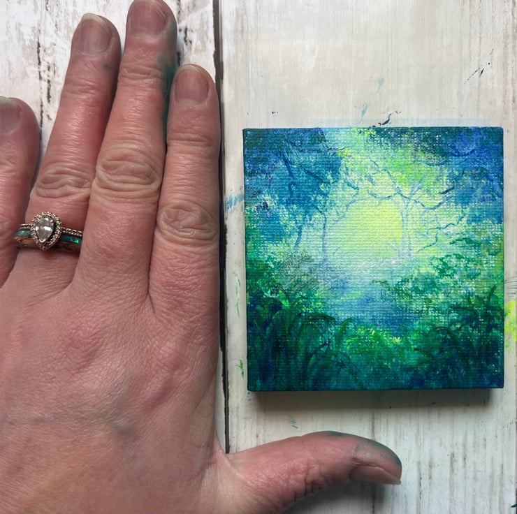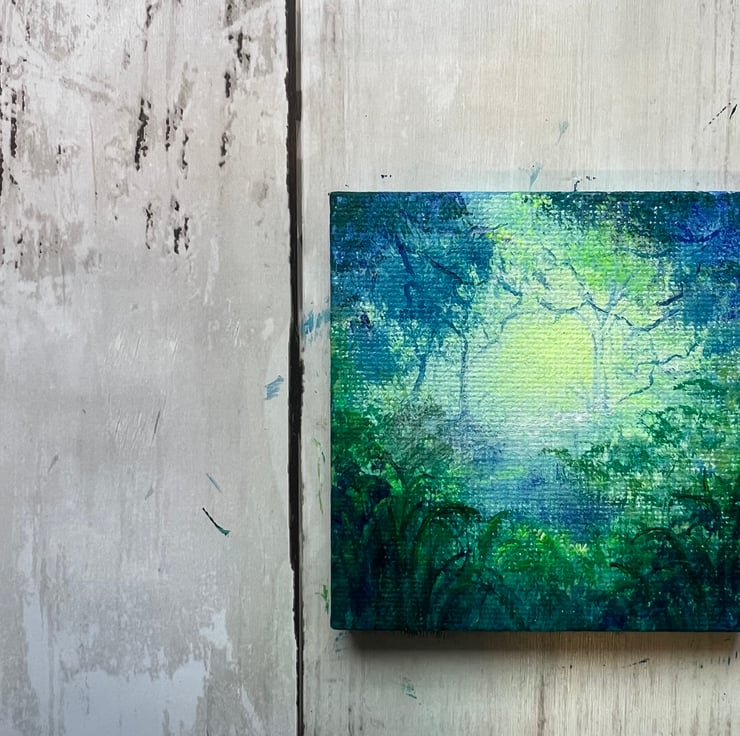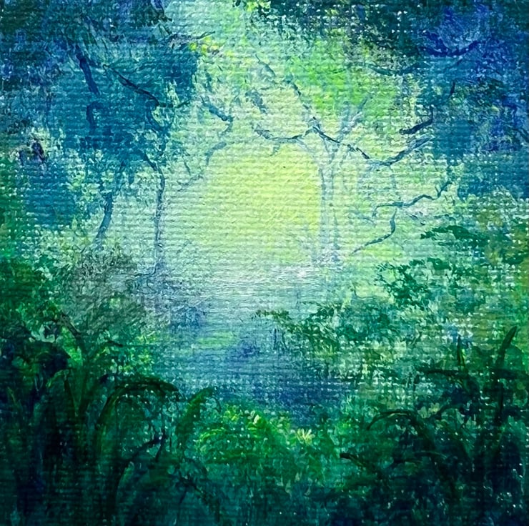 Today’s mini 7cm x 7cm painting is inspired by one of my favorite local spots—a hidden woodland oasis that appears when the Scottish rain floods the forest floor. The still water reflects the trees, creating a dreamlike world where fairies dance and magic lingers in the air. Using acrylic paints, I captured the glow of this enchanting place, where nature and fantasy intertwine.