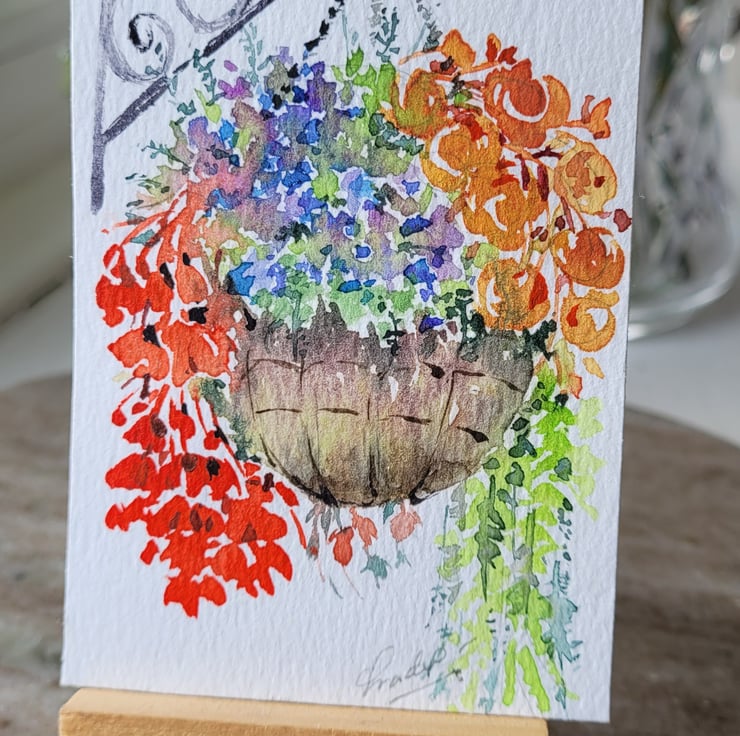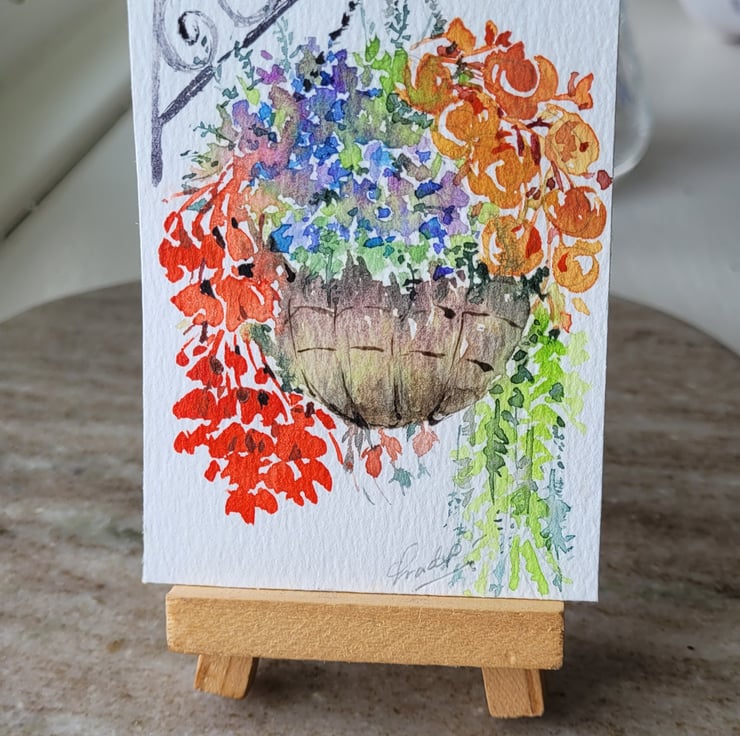 original watercolour miniature painting of hanging basket of summer flowers