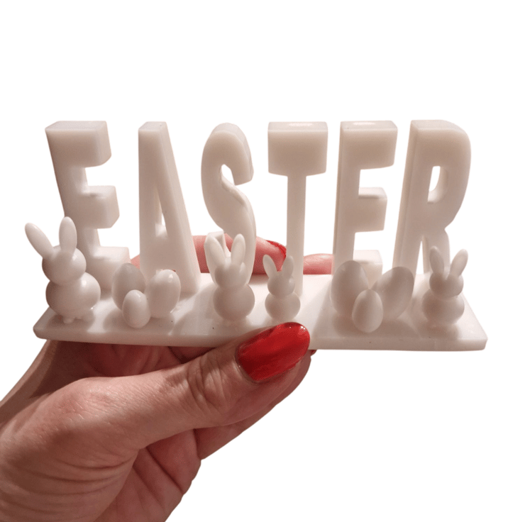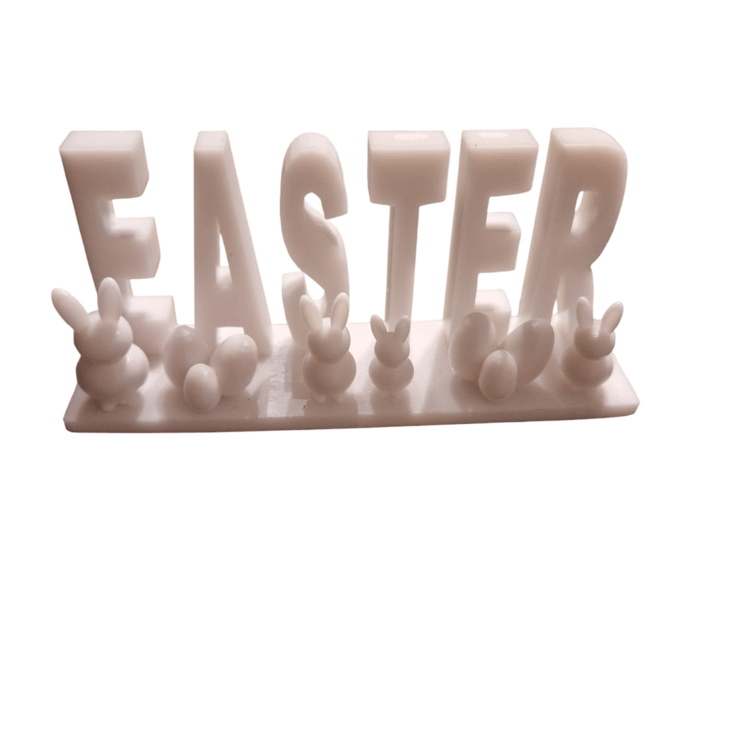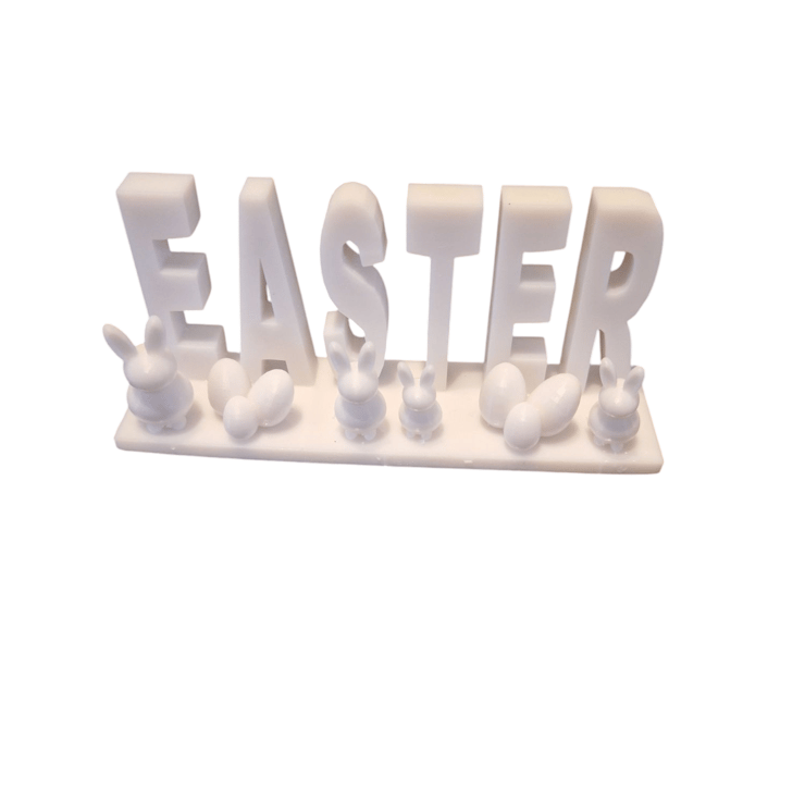 Unique white resin decoration sign with little bunnys and Easter eggs.