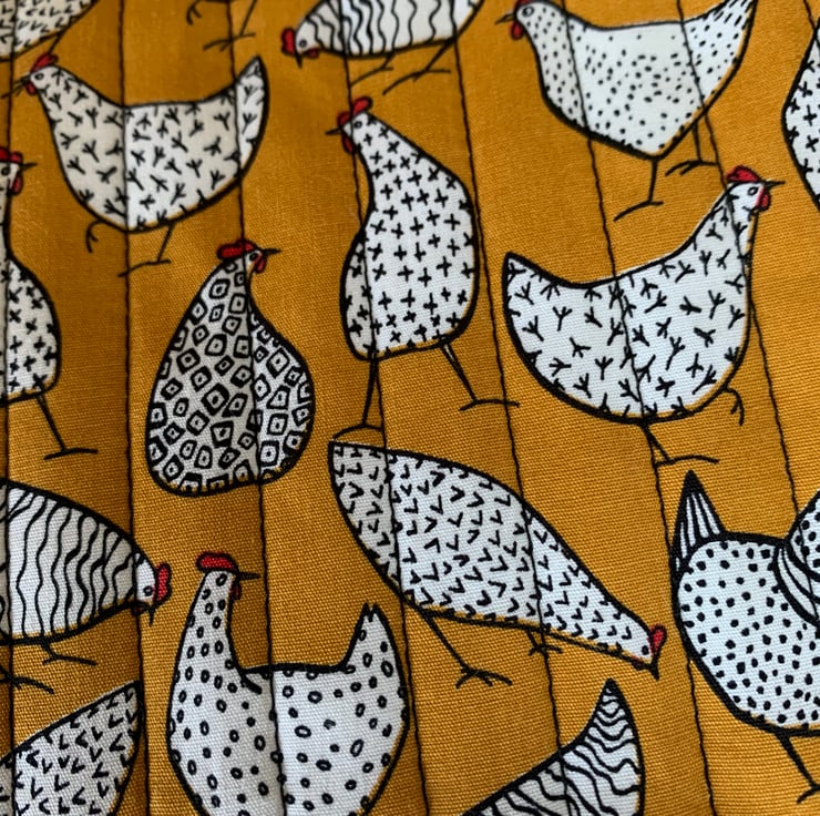 The pouch has a quilted chicken/hen print on the cotton outer with black stitching and a red zip.