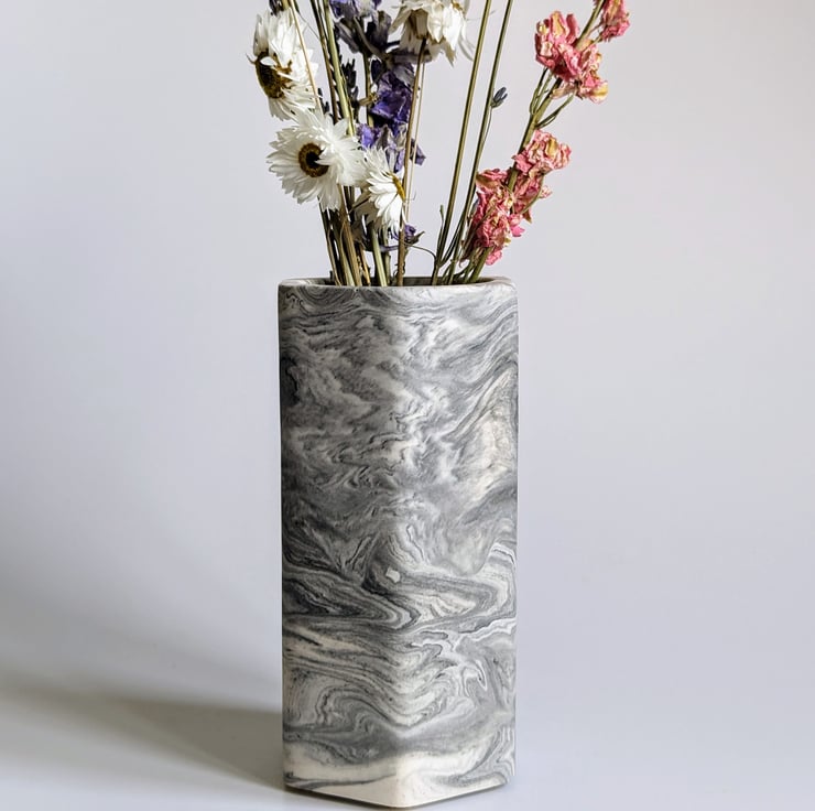 Add a touch of modern elegance to your floral displays with this chic marbled hexagon vase.