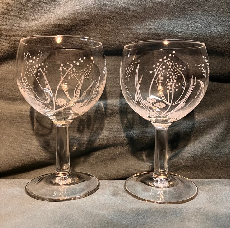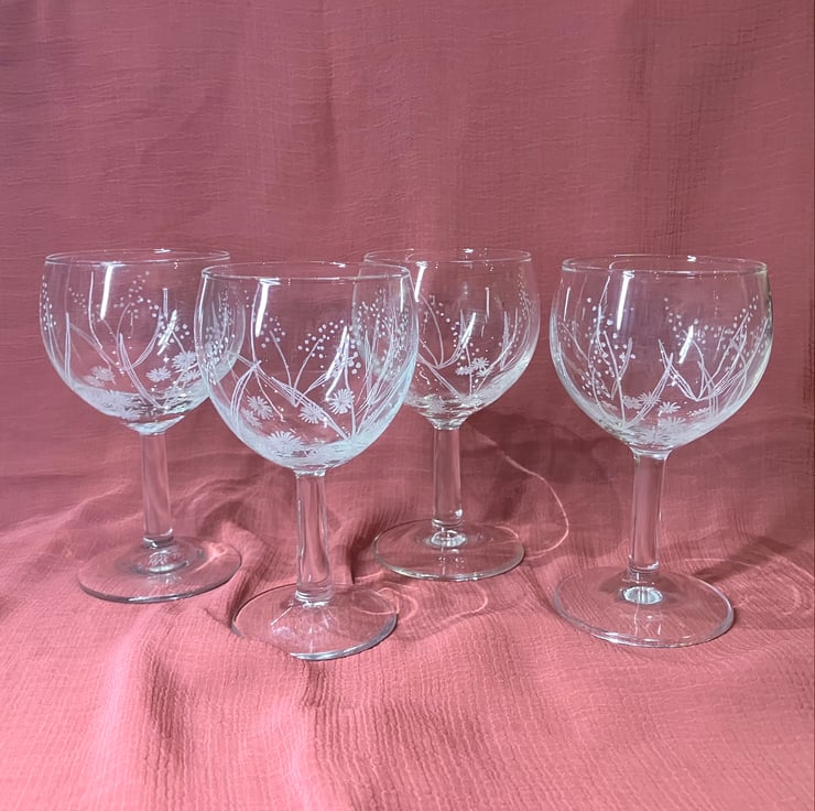 Spring is in the air! And to celebrate, these wine glasses have been hand engraved with grape hyacinths and daisies. I love how these plain second hand glasses have been transformed by this ditzy design into such pretty tableware.