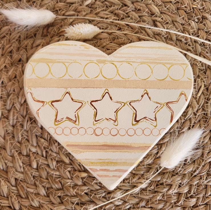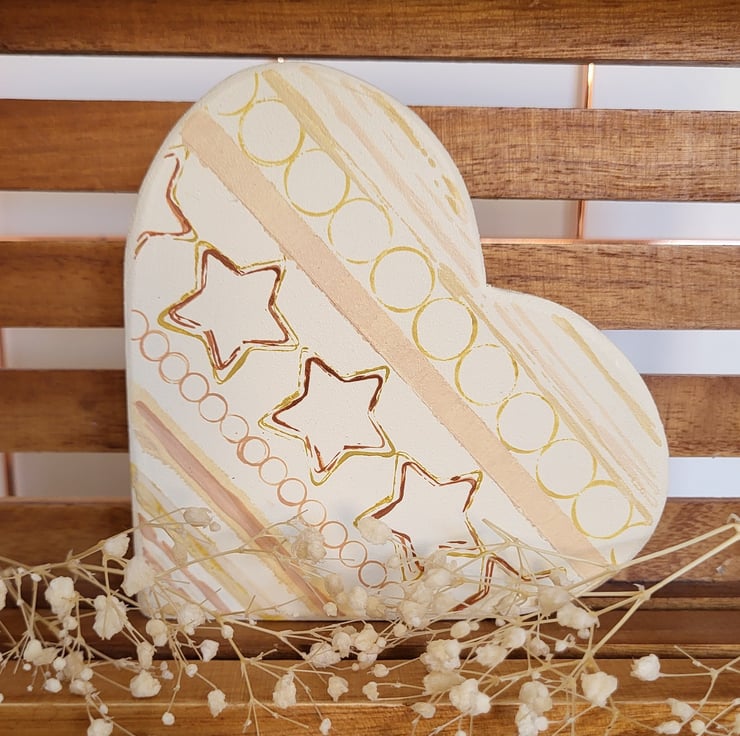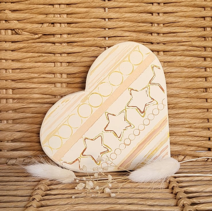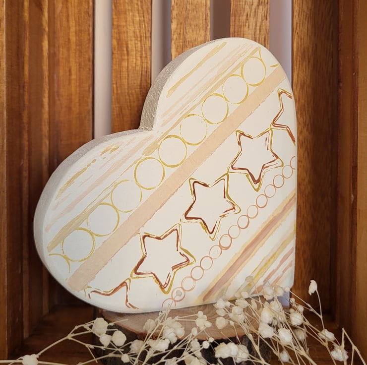 This free standing heart decoration comes in lovely natural tones with accents of pastel pink and delicate shades of yellow ochre to form a pretty and gentle geometric pattern with stars and circles.
