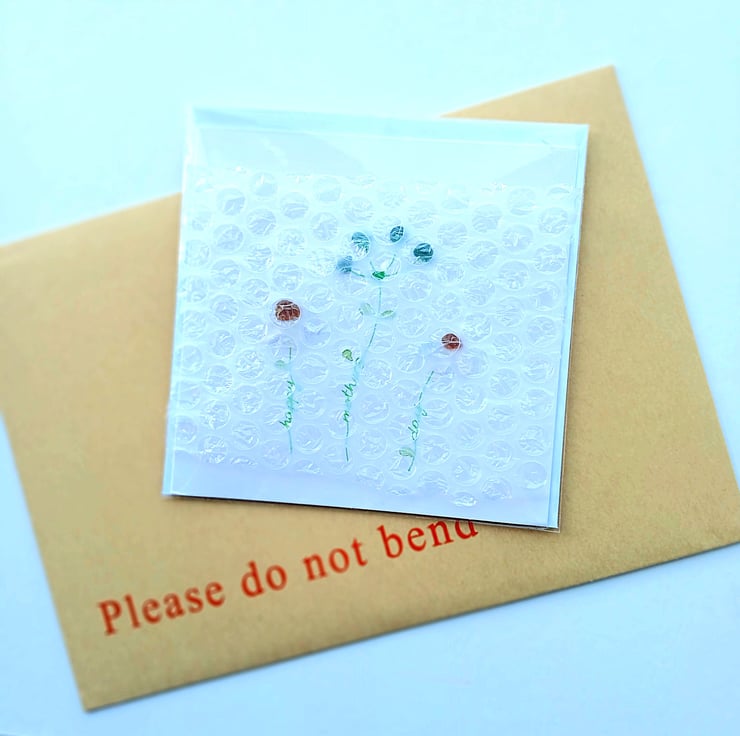 The card and envelope are presented in a clear cellophane wallet lined with bubble wrap to protect the glass elements.