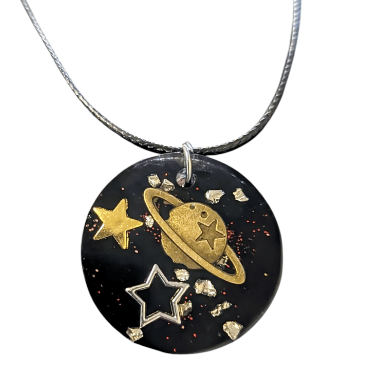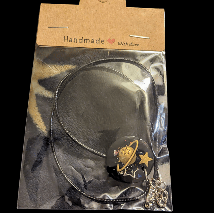 Handmade using resin and all things pretty and interesting on a faux leather chain. Space theme. A perfect gift for adults/teens/child male or female if you're looking for something unique