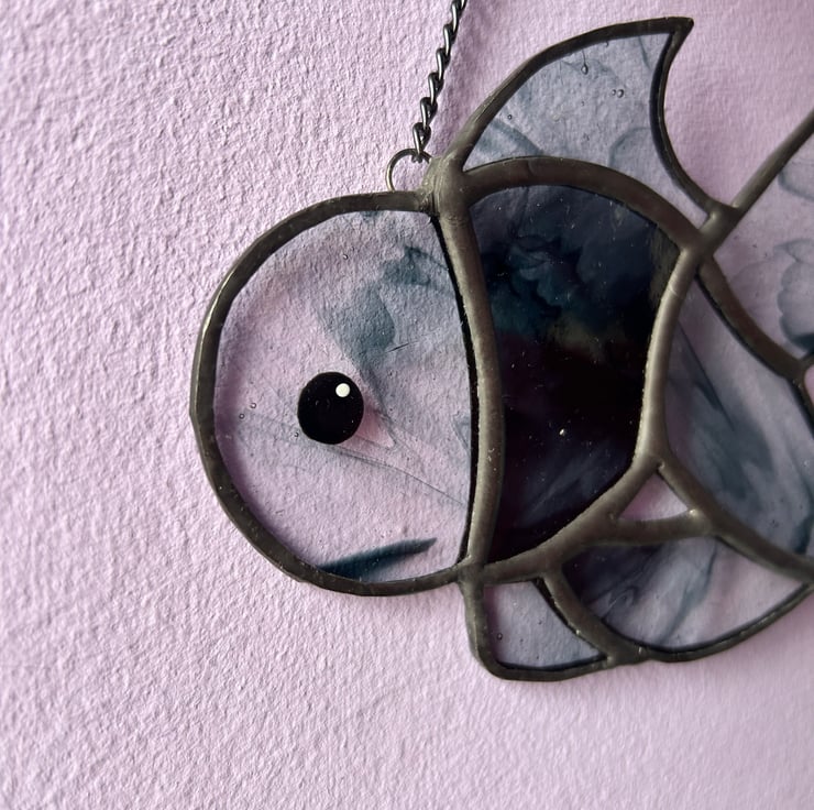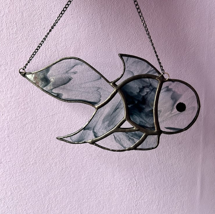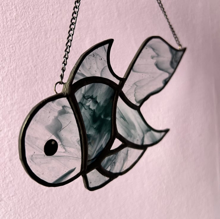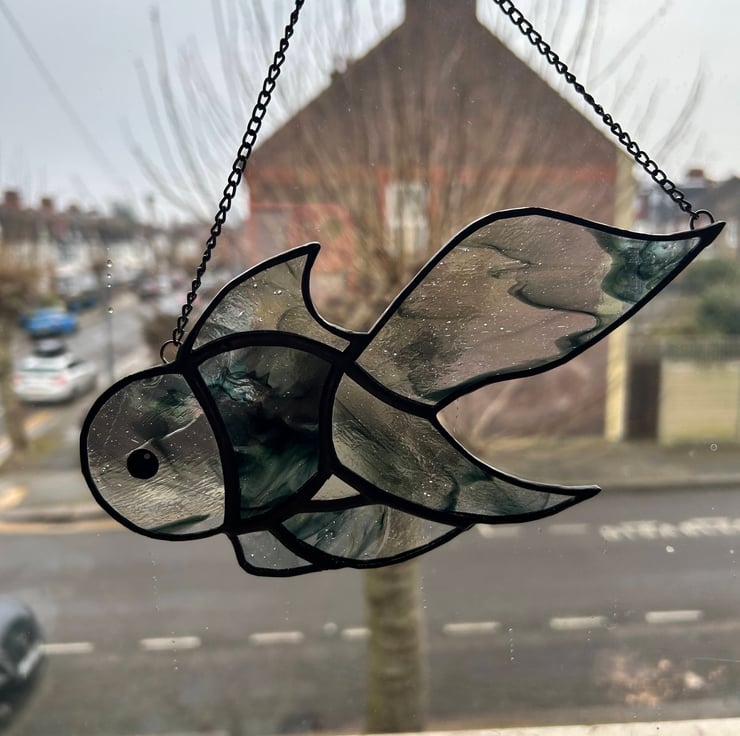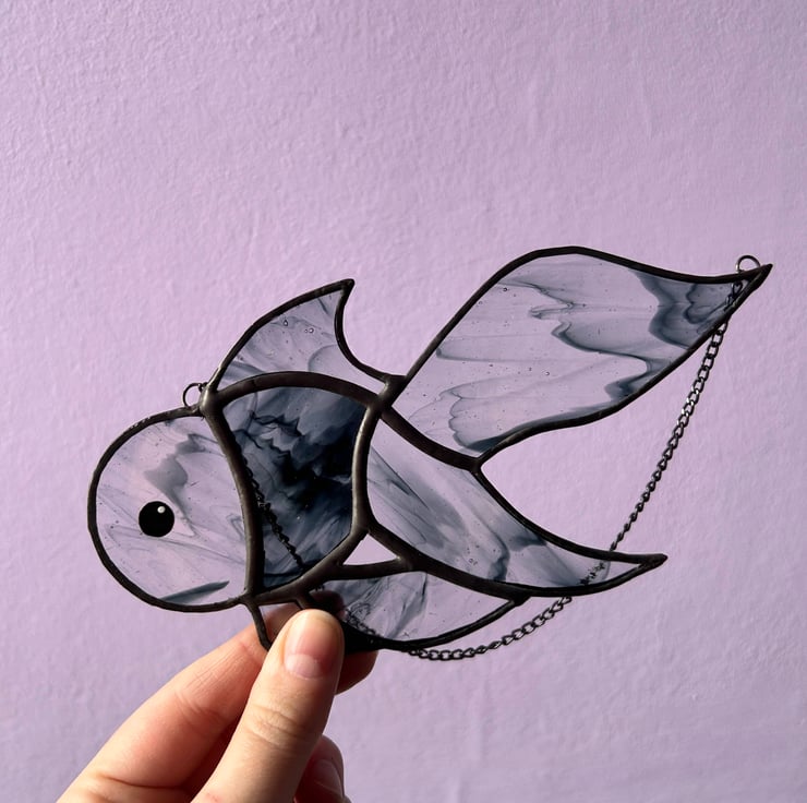 A striking stained glass fish crafted from wispy black and clear glass, creating an elegant, flowing effect. The hand-painted eye adds a unique touch, giving it personality and depth.Whether it’s swimming in your window or hanging on your wall, it plays with the light in the most magical way.