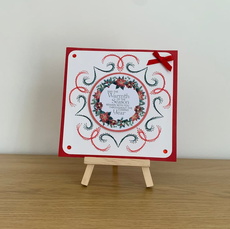Hand embroidered onto white textured card using red and green shimmer thread which is then attached to the front of the card.