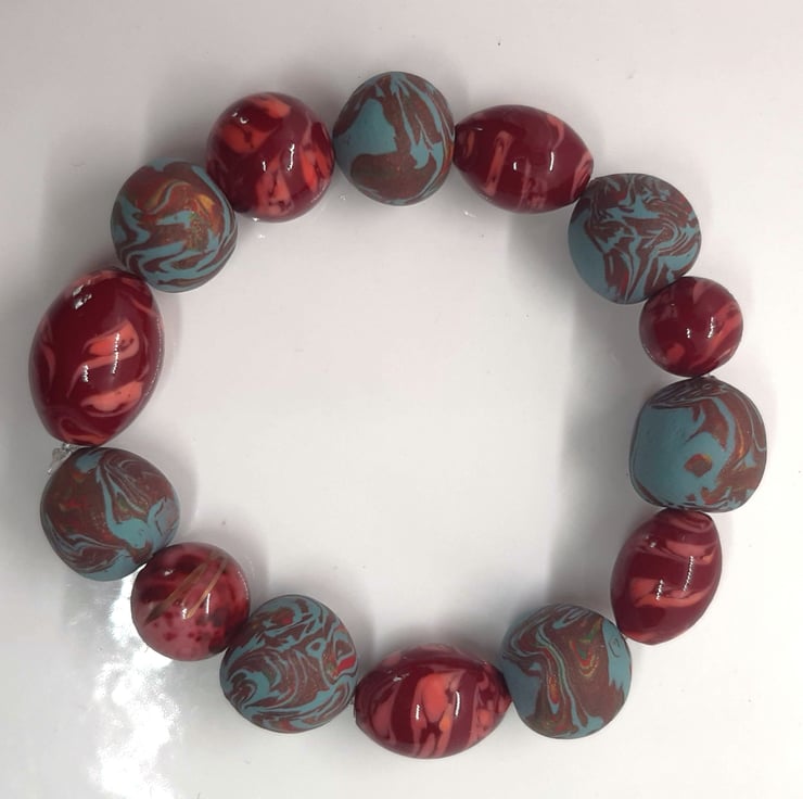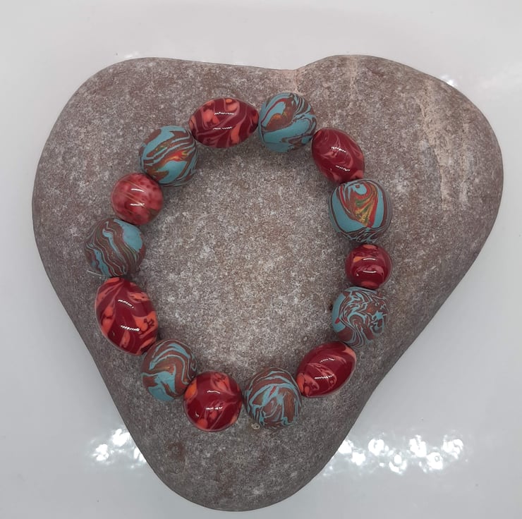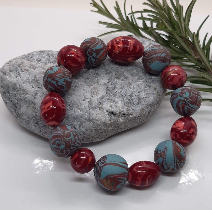 An attractive bracelet featuring handmade polymer clay beads in a mixture of teal, red and gold to create a unique swirl design.
