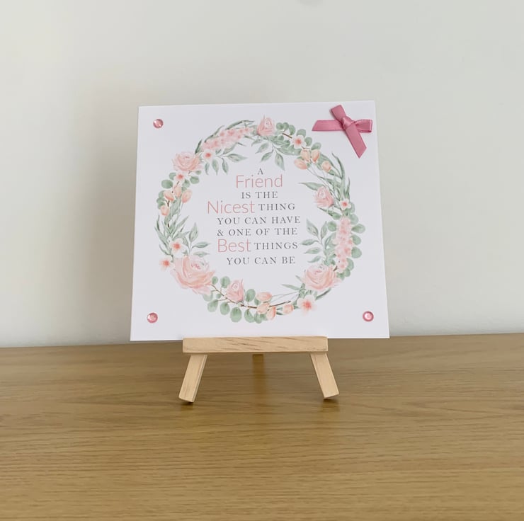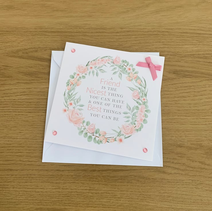 The front of the card is embellished with a satin bow & coordinating rhinestones.
