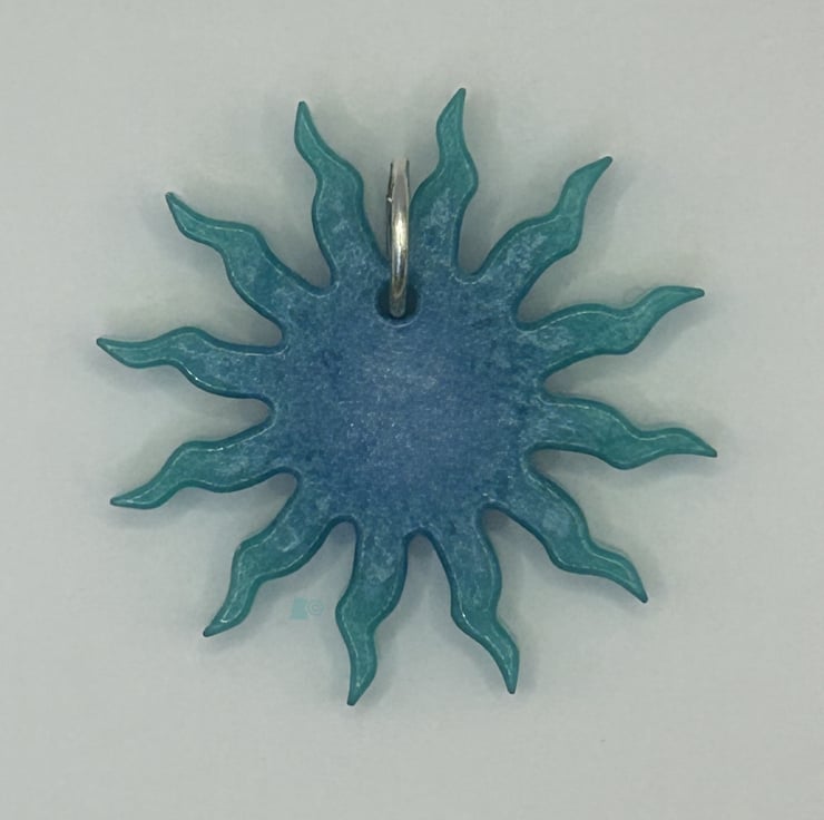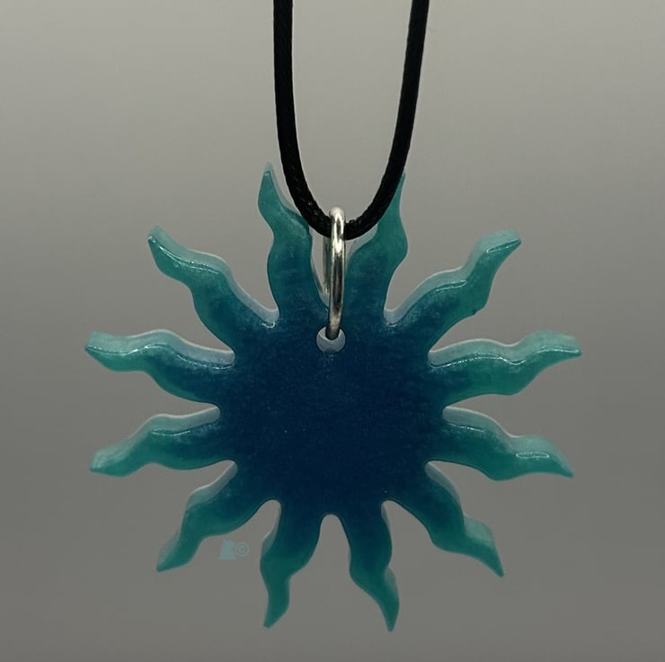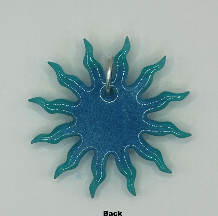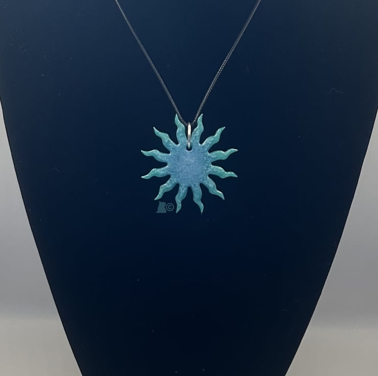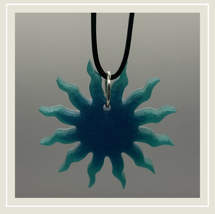 Sunny days are here again, eventually. This little green and blue pendant represents the sun with it's rays or beams reaching out from the central disc. Just like this sunburst you'll be positively beaming with radiance as you wear it out and about.