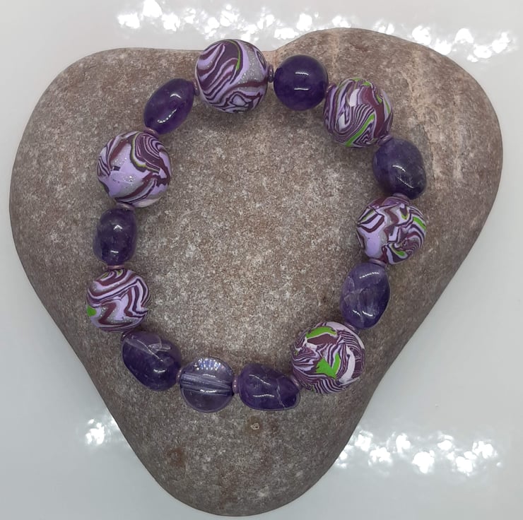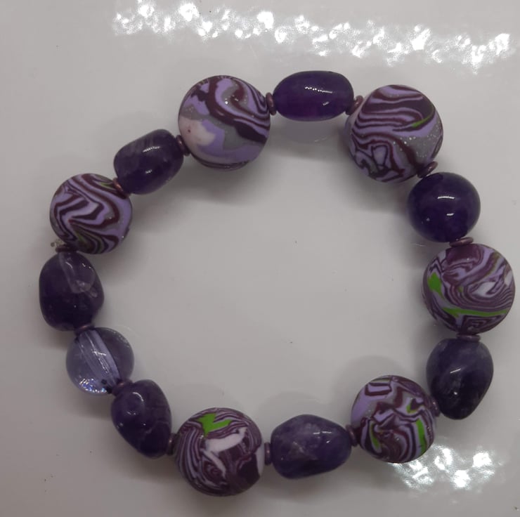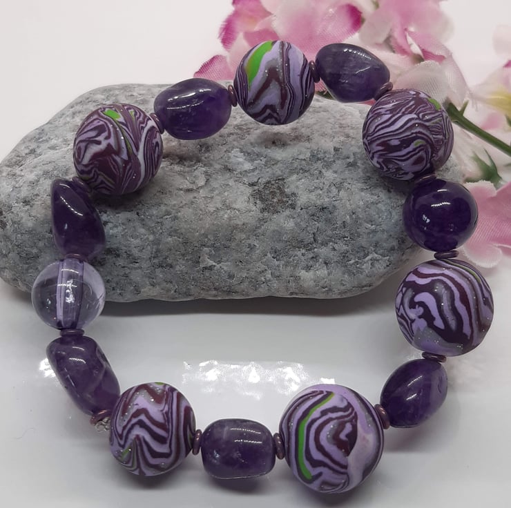 A pretty bracelet featuring handmade polymer clay beads in a purple, lilac, silver and green unique swirl design with a hint of sparkle.