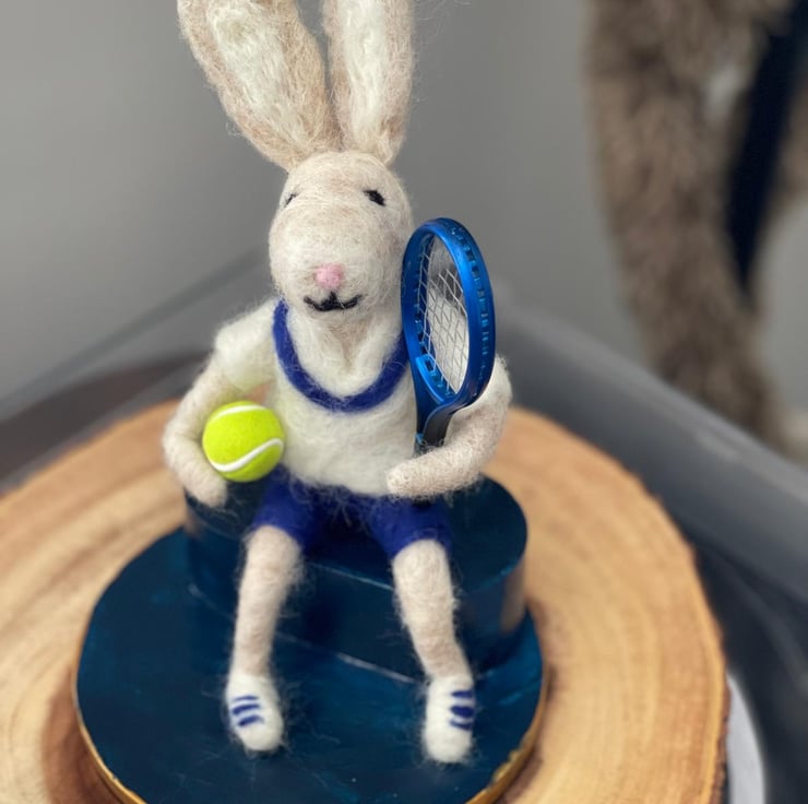 Tennis-playing bunny. Made with Corriedale silver wool with a wire armature. Bench made with cement, painted with acrylic paints and varnish. Indoor display only. Avoid direct contact with water or heat. To be kept out of reach of children and animals. All handmade in my studio in UK. Custom-made order available, in various colours. Please email me for details.