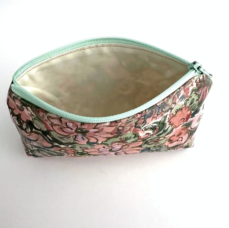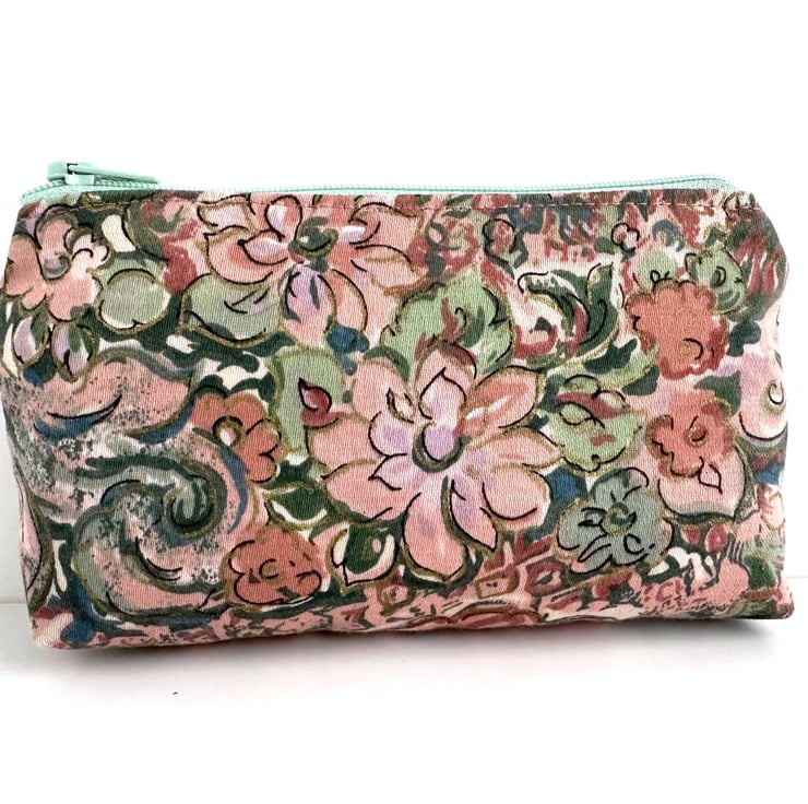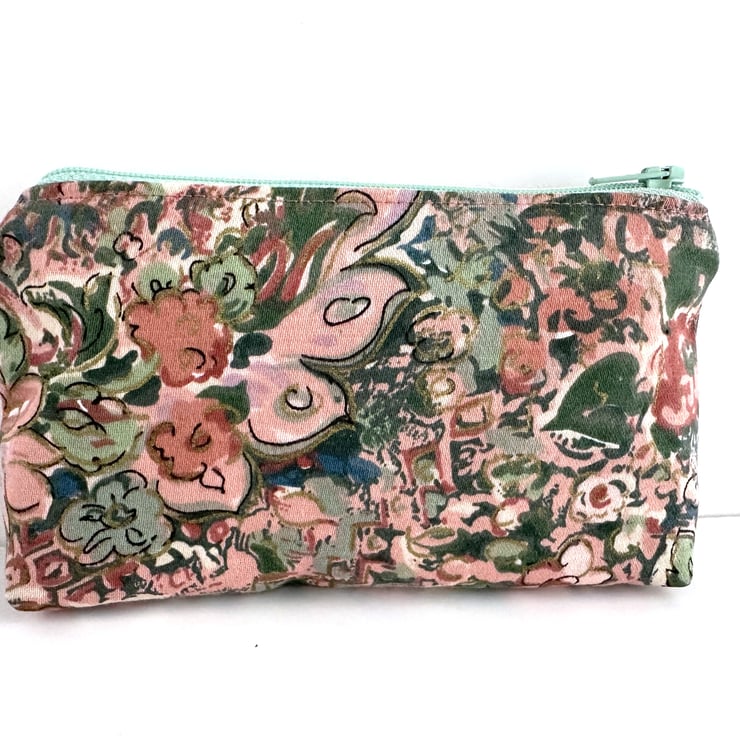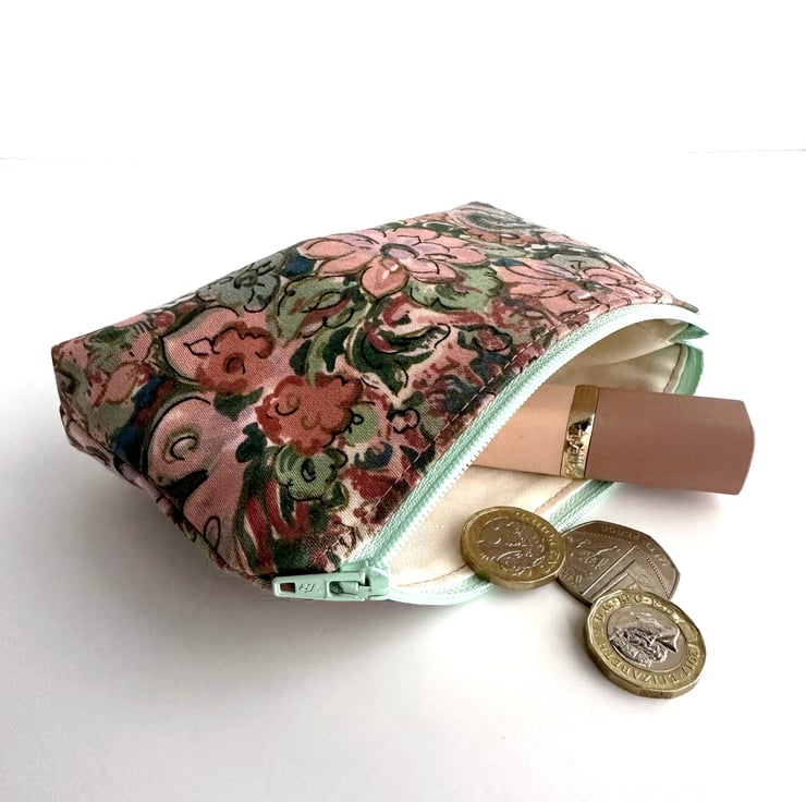 This large coin purse is made from a lovely floral fabric. The pattern is depicted in pretty coral and salmon pinks, cool greens, and has touches of lilac and teal. The pattern is picked out with gold and black detailing. The purse fastens with a matching pale green zip and is lined with cream fabric. The base of the purse is boxed to give more room inside.