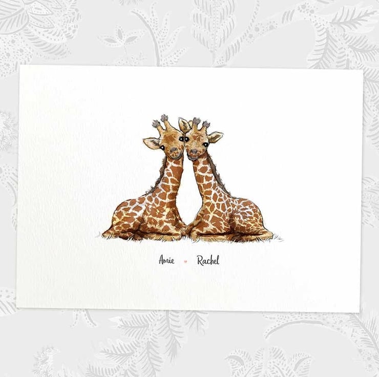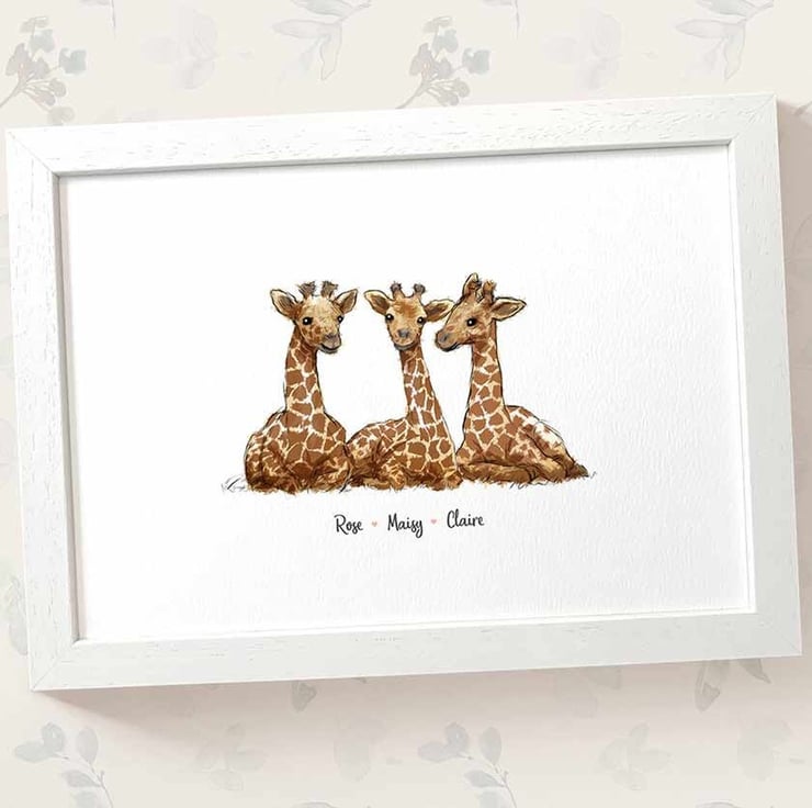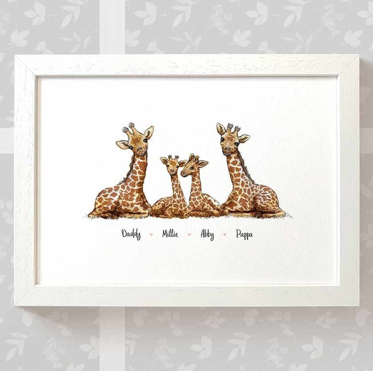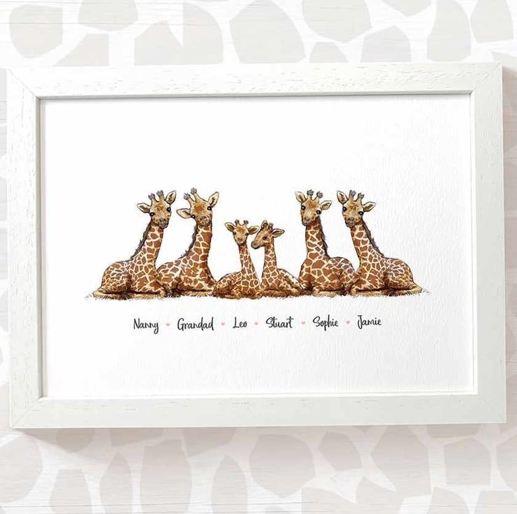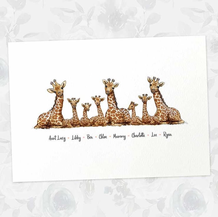 This personalised family portrait includes an adorable giraffe family and can be customised to include any number of adults and children, with an optional title at the top and names below. Simply provide your details in the personalisation box when placing your order, and we’ll create your one-of-a-kind design. For an extra special touch, you can request different sizes for the children—just include their ages, and we'll use them as a guide.