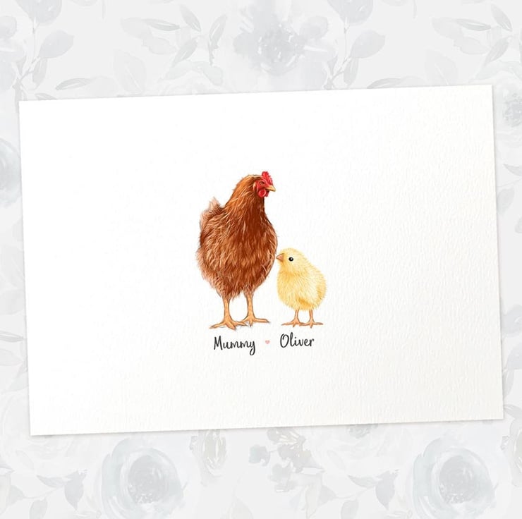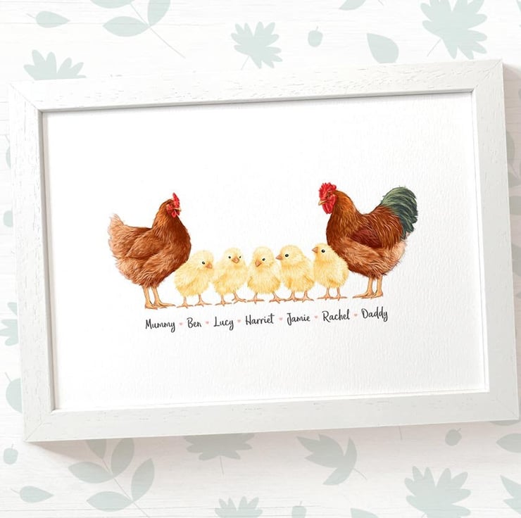 This personalised family portrait includes an adorable chicken family and can be customised to include any number of adults and children, with an optional title at the top and names below. Simply provide your details in the personalisation box when placing your order, and we’ll create your one-of-a-kind design. For an extra special touch, you can request different sizes for the children—just include their ages, and we'll use them as a guide.