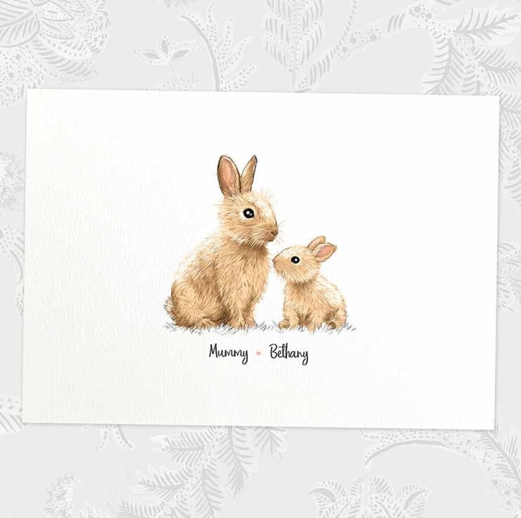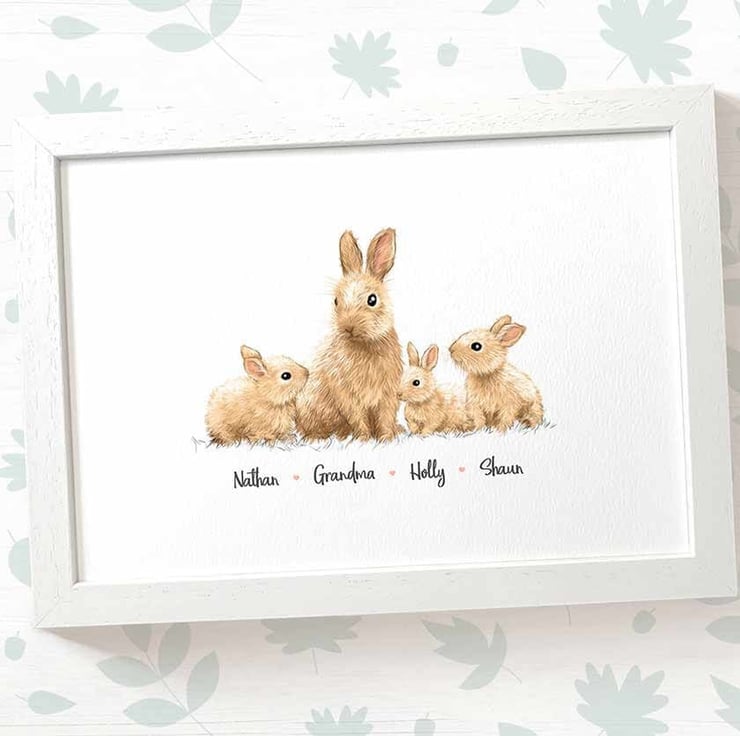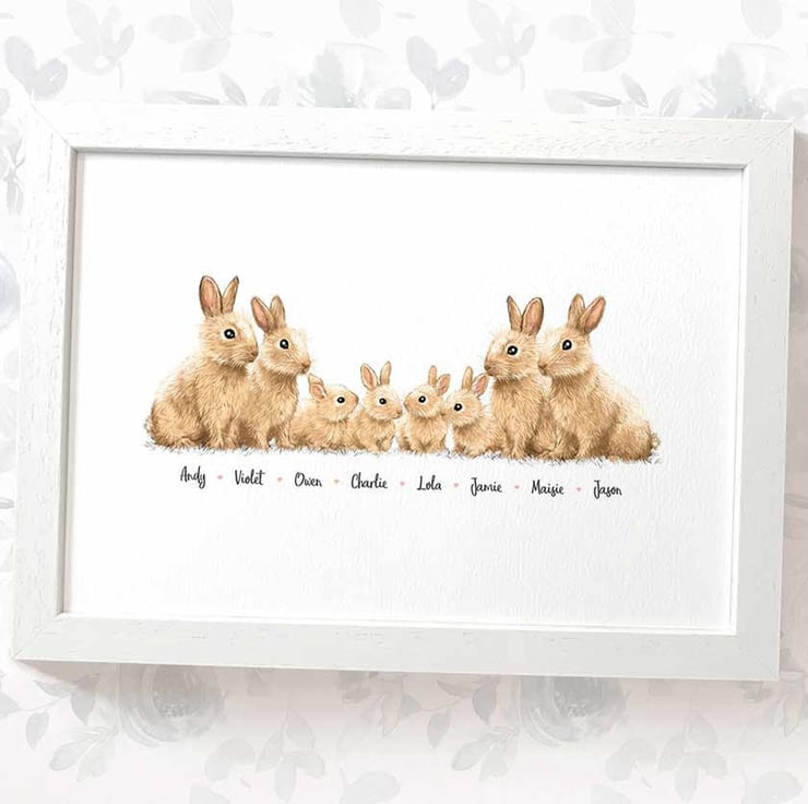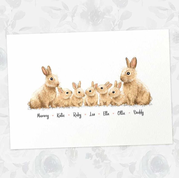This personalised family portrait showcases an adorable bunny rabbit family and can be customised to include any number of adults and children, with an optional title at the top and names below. Simply provide your details in the personalisation box when placing your order, and we’ll create your one-of-a-kind design. For an extra special touch, you can request different sizes for the children—just include their ages, and we'll use them as a guide.