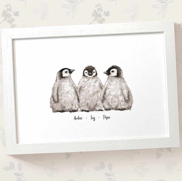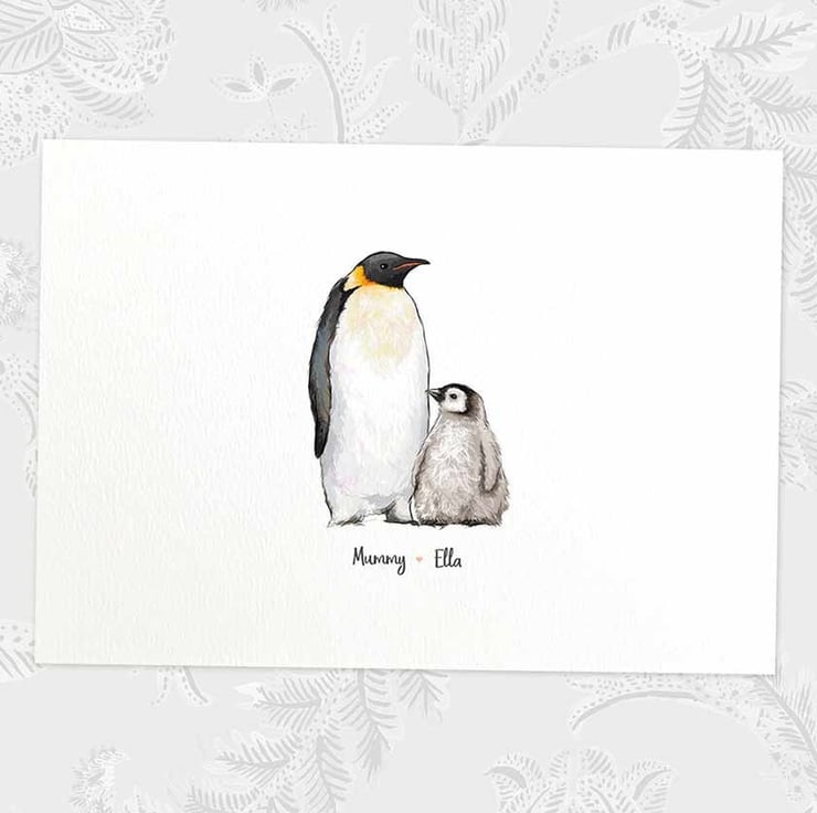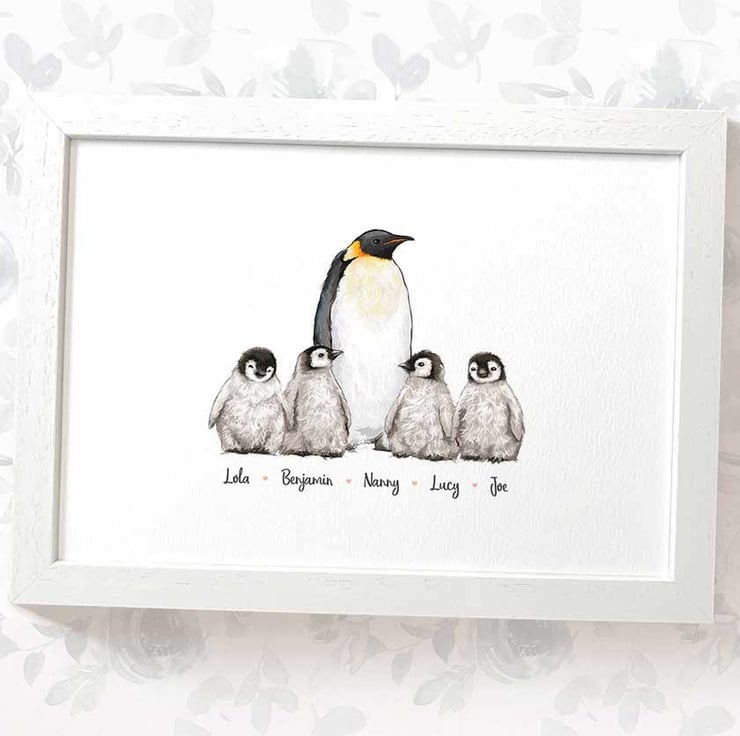 This personalised family portrait includes an adorable penguin family and can be customised to include any number of adults and children, with an optional title at the top and names below. Simply provide your details in the personalisation box when placing your order, and we’ll create your one-of-a-kind design. For an extra special touch, you can request different sizes for the children—just include their ages, and we'll use them as a guide.