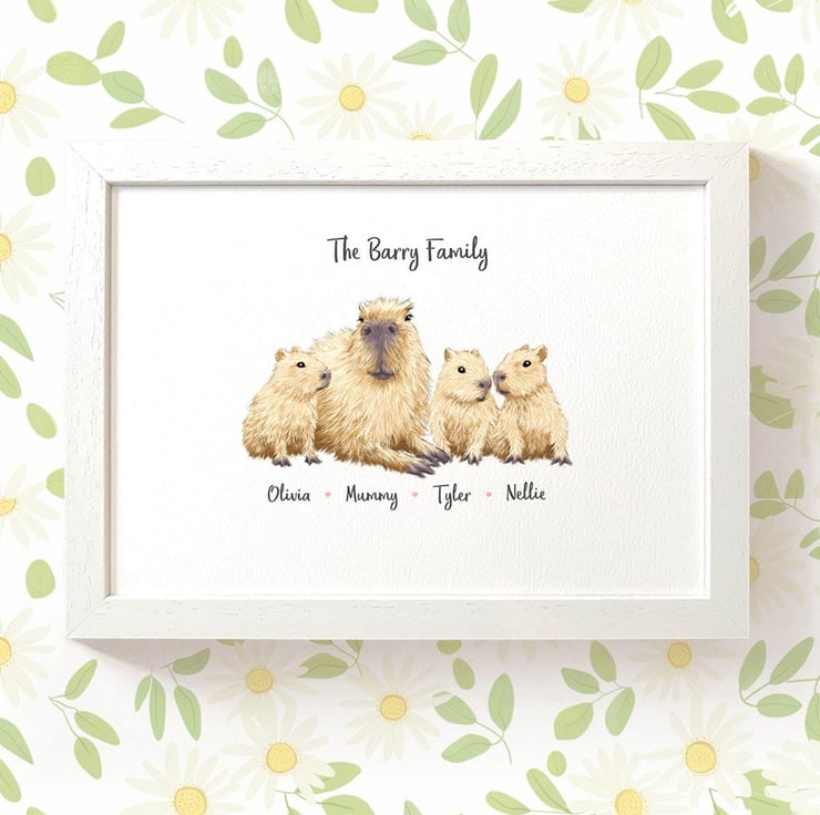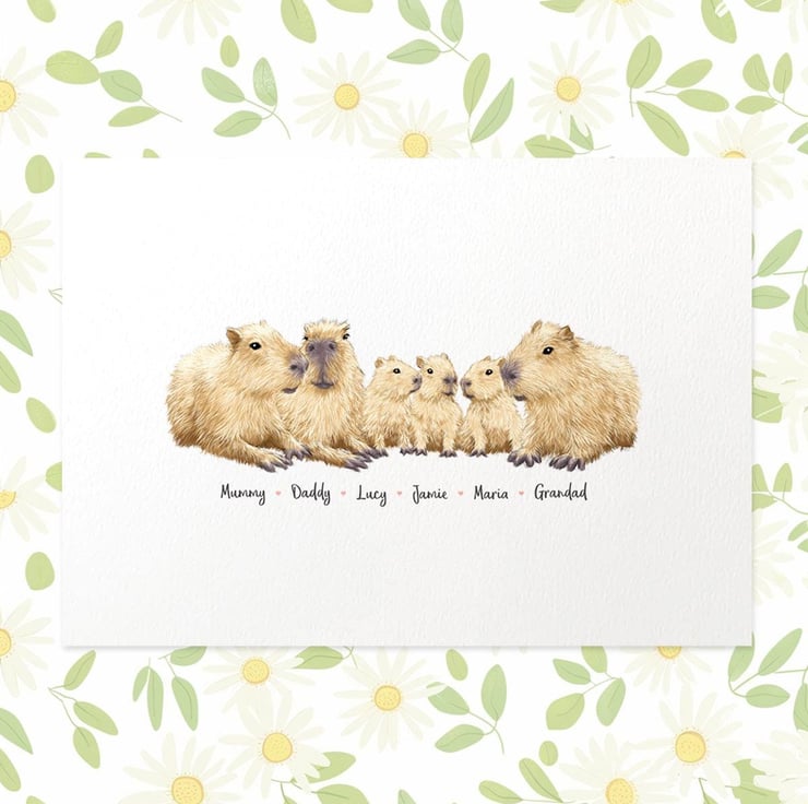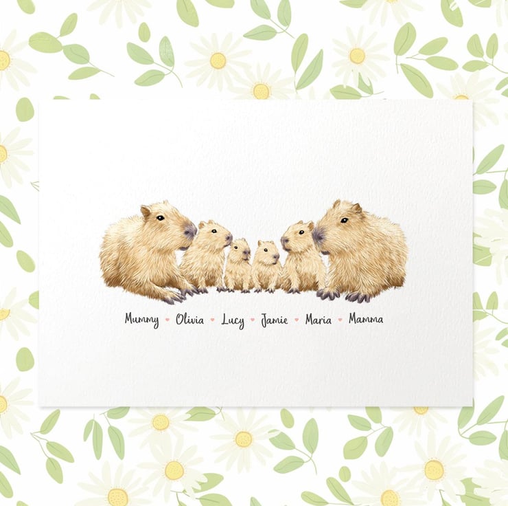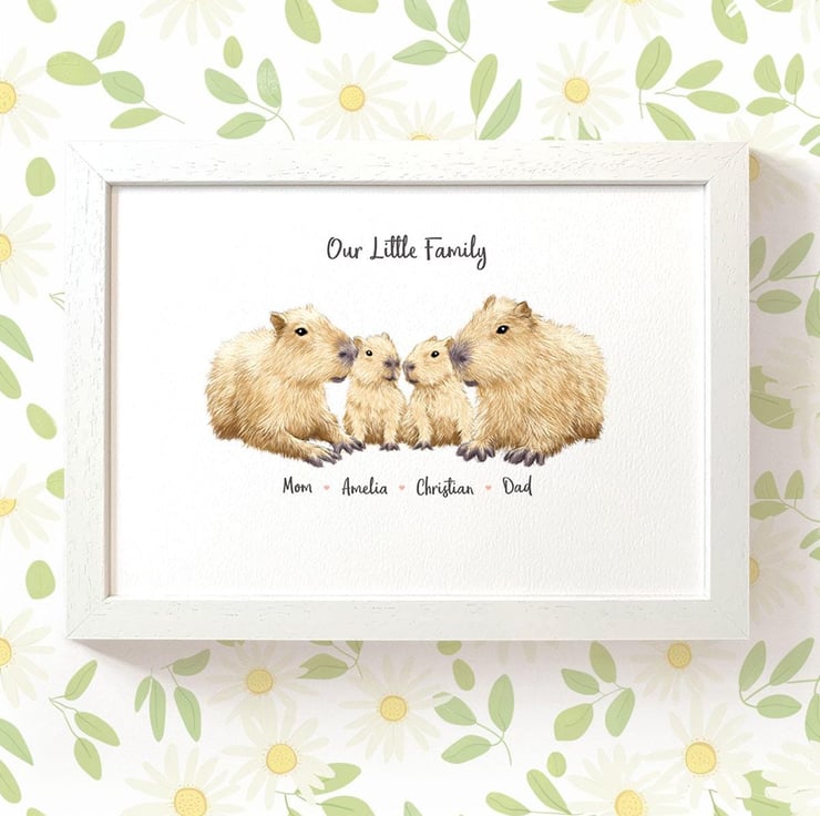 This personalised family portrait showcases an adorable capybara family and can be customised to include any number of adults and children, with an optional title at the top and names below. Simply provide your details in the personalisation box when placing your order, and we’ll create your one-of-a-kind design. For an extra special touch, you can request different sizes for the children—just include their ages, and we'll use them as a guide.