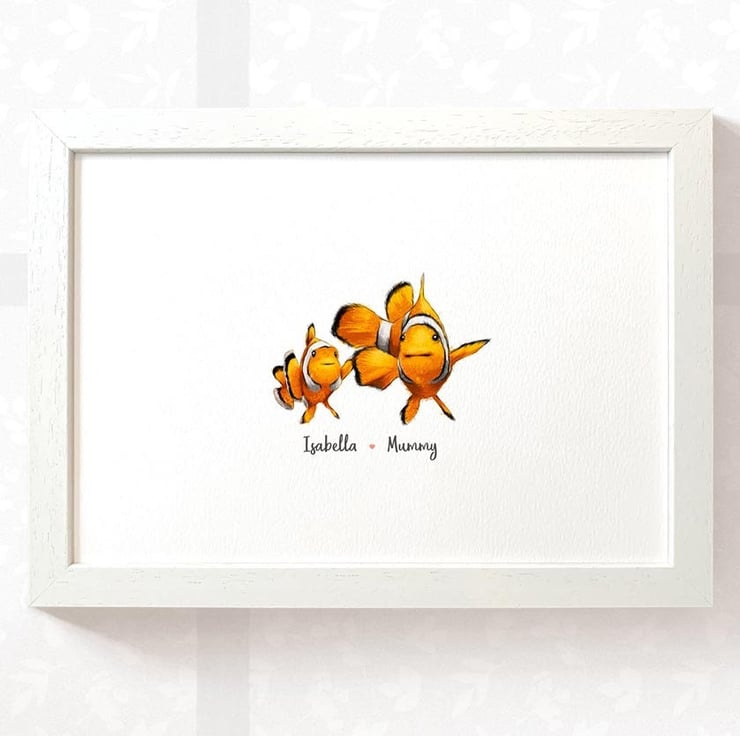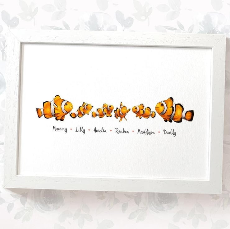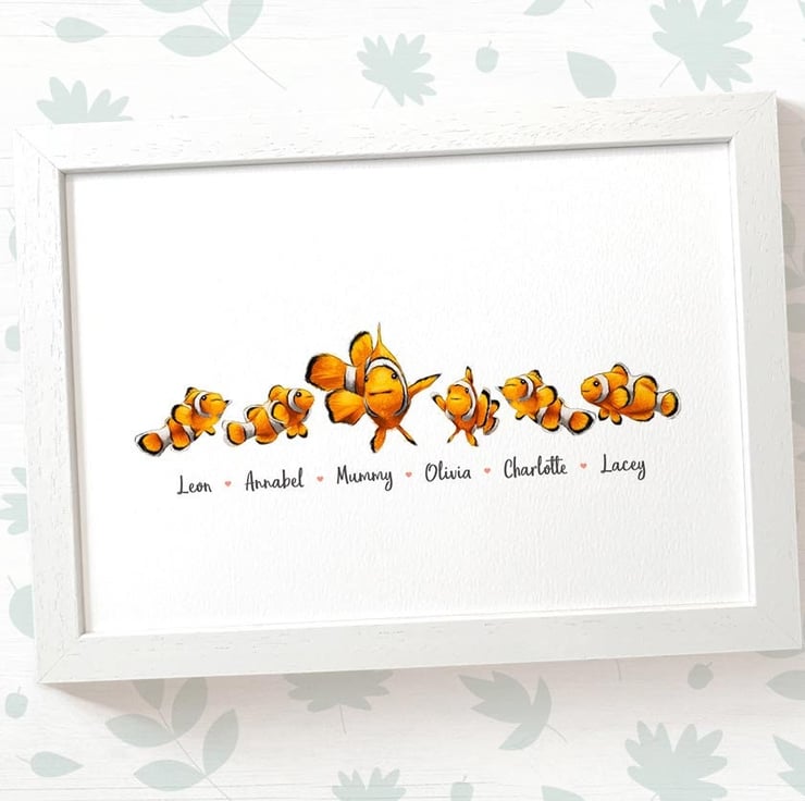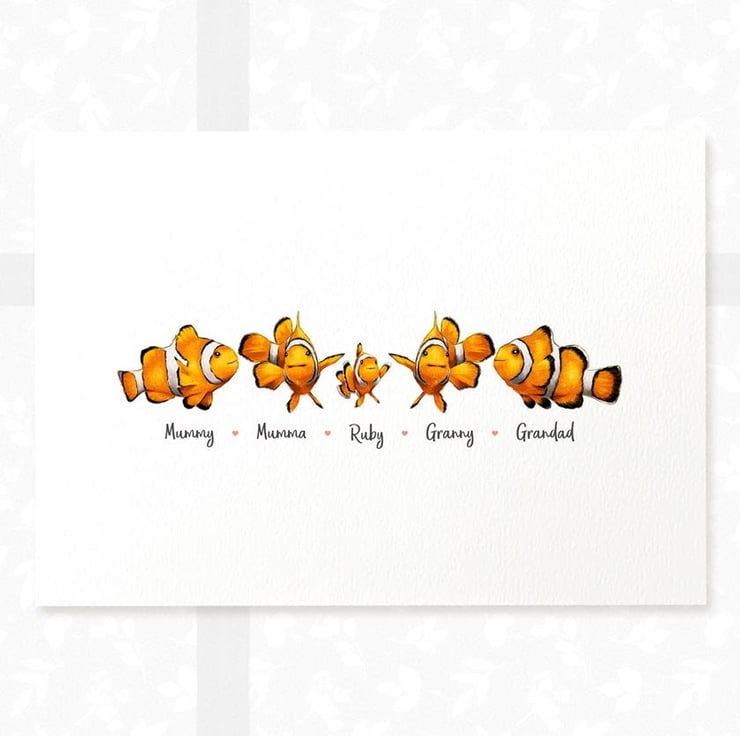 This personalised family portrait showcases an adorable clown fish family and can be customised to include any number of adults and children, with an optional title at the top and names below. Simply provide your details in the personalisation box when placing your order, and we’ll create your one-of-a-kind design. For an extra special touch, you can request different sizes for the children—just include their ages, and we'll use them as a guide.