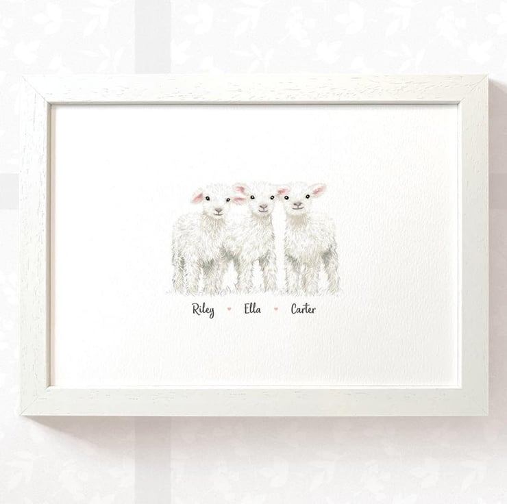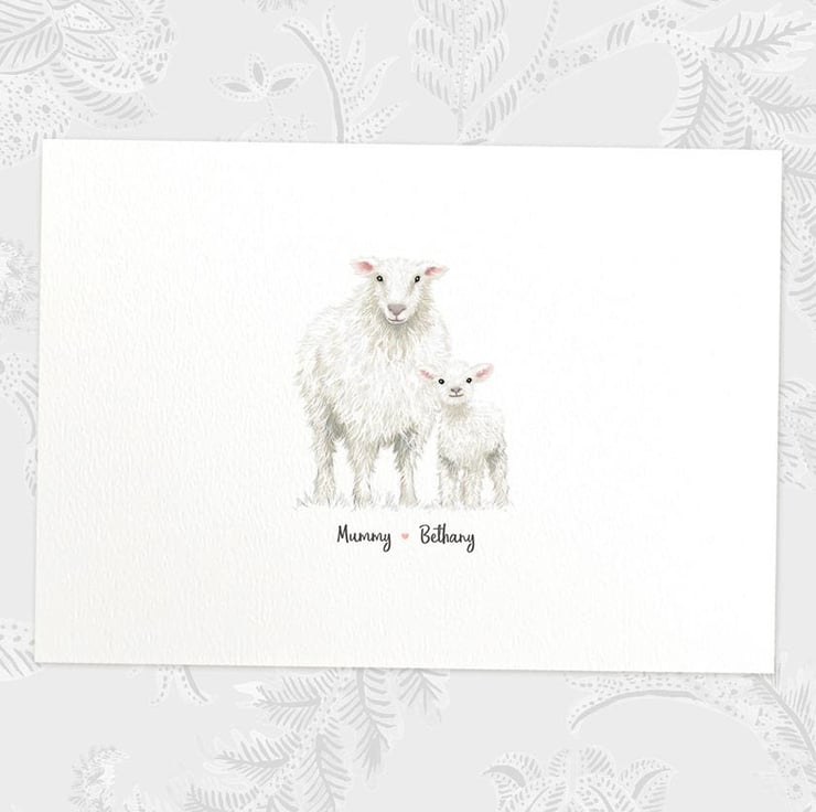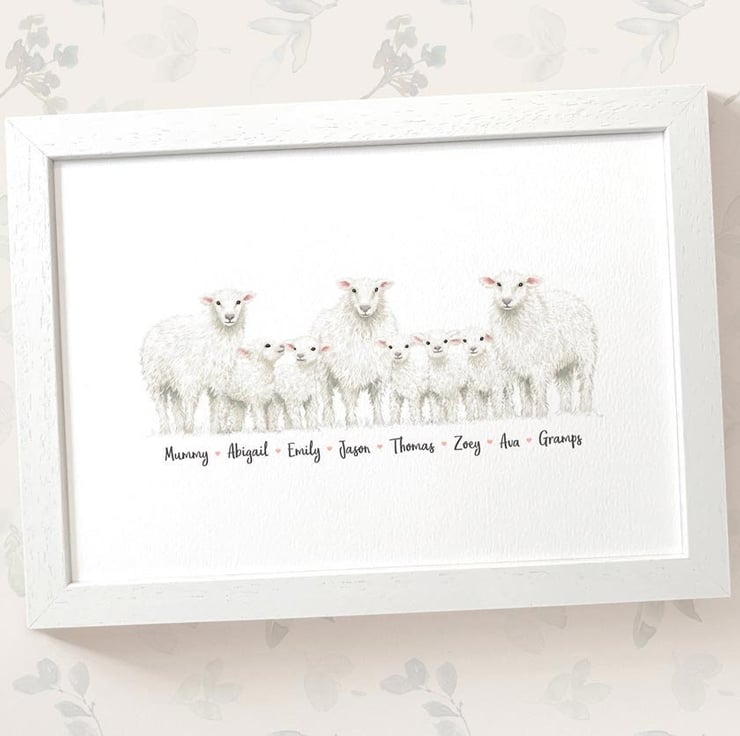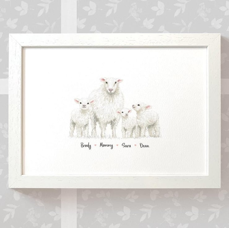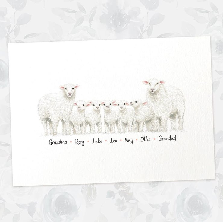 This personalised family portrait showcases an adorable sheep family and can be customised to include any number of adults and children, with an optional title at the top and names below. Simply provide your details in the personalisation box when placing your order, and we’ll create your one-of-a-kind design. For an extra special touch, you can request different sizes for the children—just include their ages, and we'll use them as a guide.