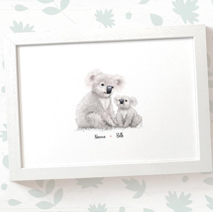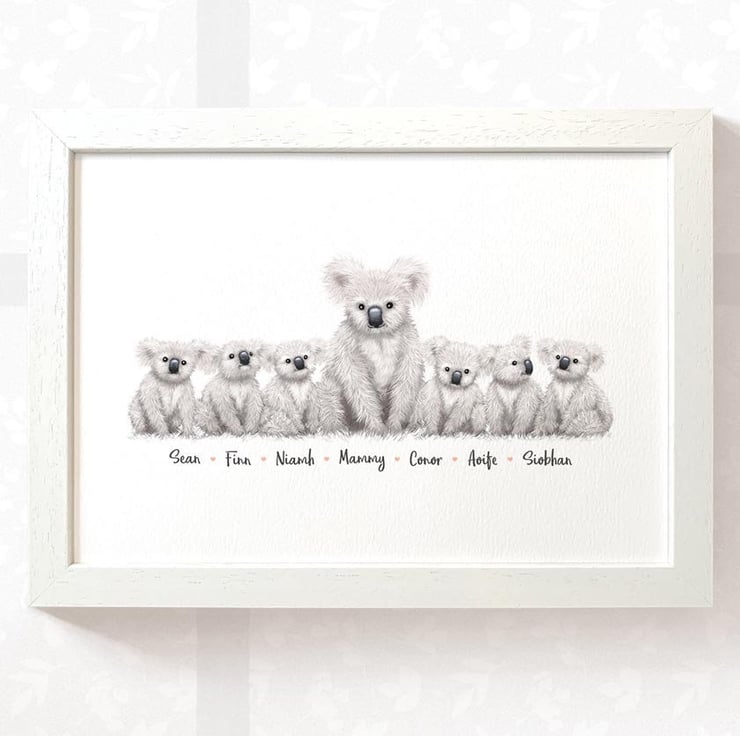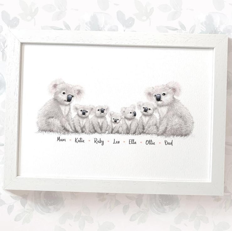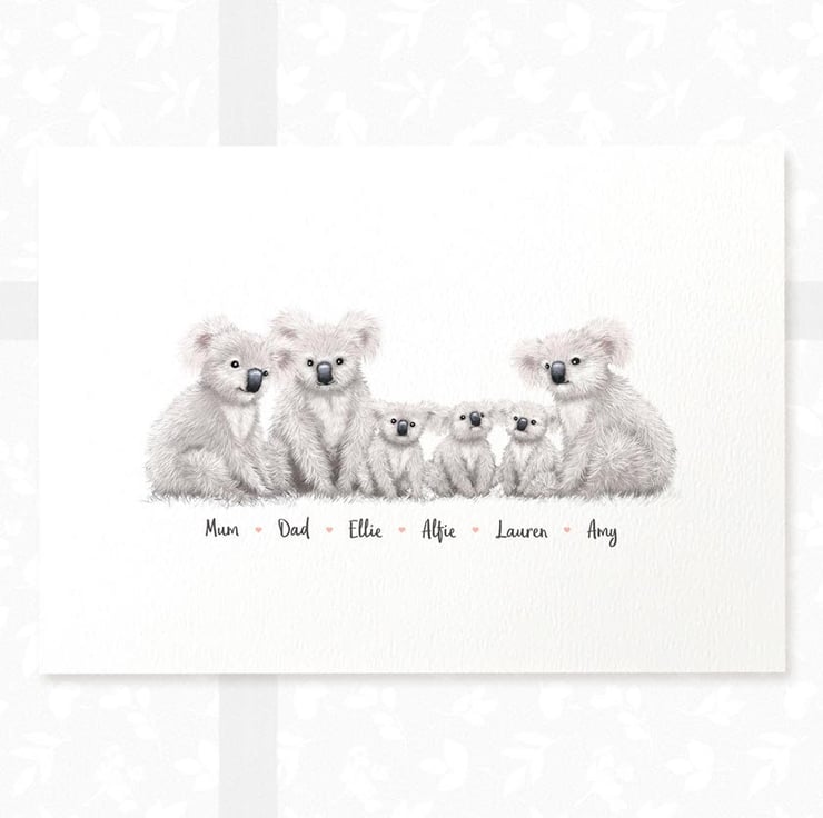 This personalised family portrait showcases an adorable koala family and can be customised to include any number of adults and children, with an optional title at the top and names below. Simply provide your details in the personalisation box when placing your order, and we’ll create your one-of-a-kind design. For an extra special touch, you can request different sizes for the children—just include their ages, and we'll use them as a guide.