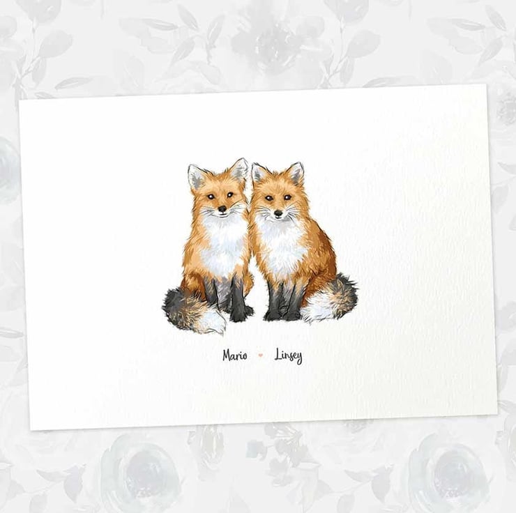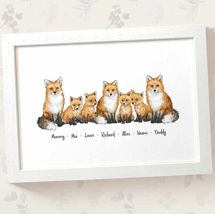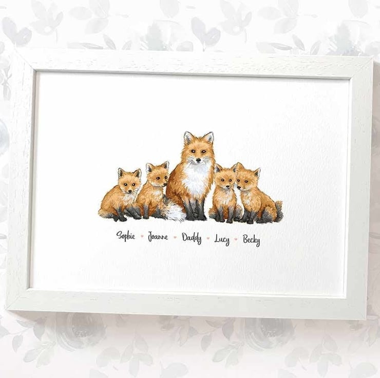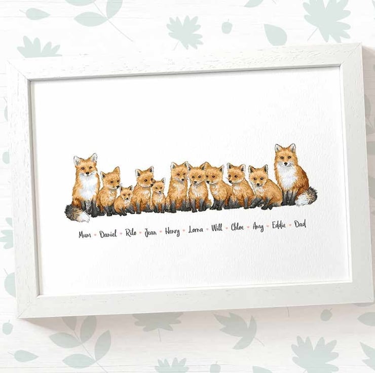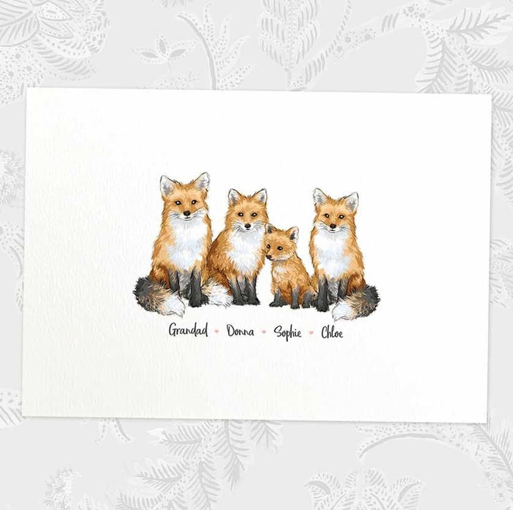 This personalised family portrait showcases an adorable fox family and can be customised to include any number of adults and children, with an optional title at the top and names below. Simply provide your details in the personalisation box when placing your order, and we’ll create your one-of-a-kind design. For an extra special touch, you can request different sizes for the children—just include their ages, and we'll use them as a guide.
