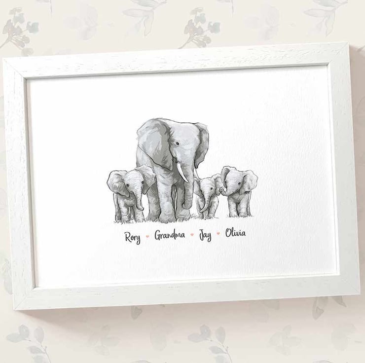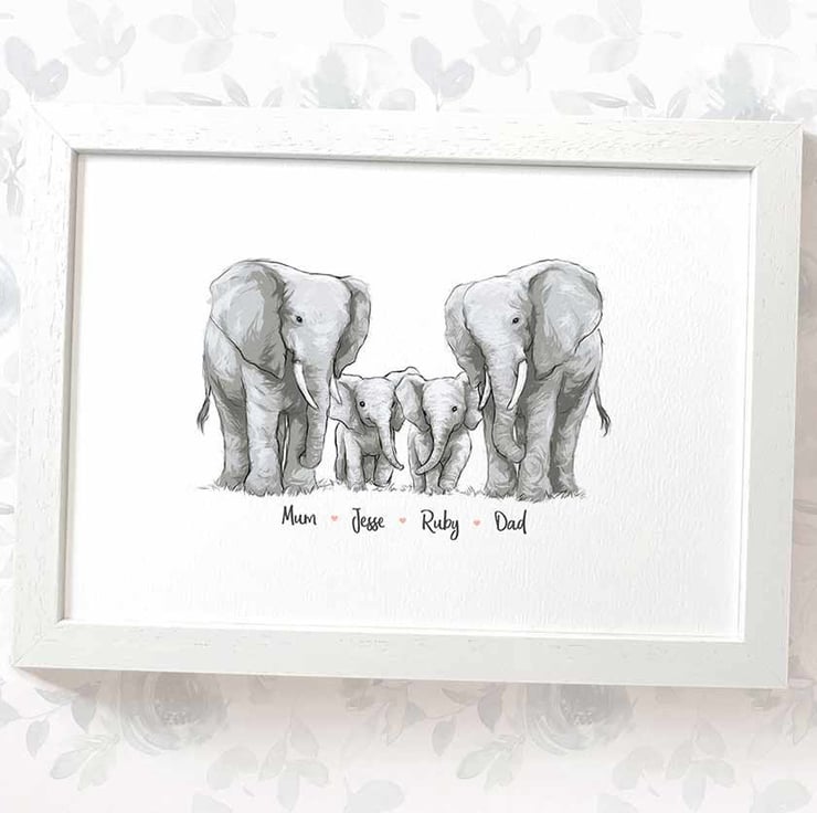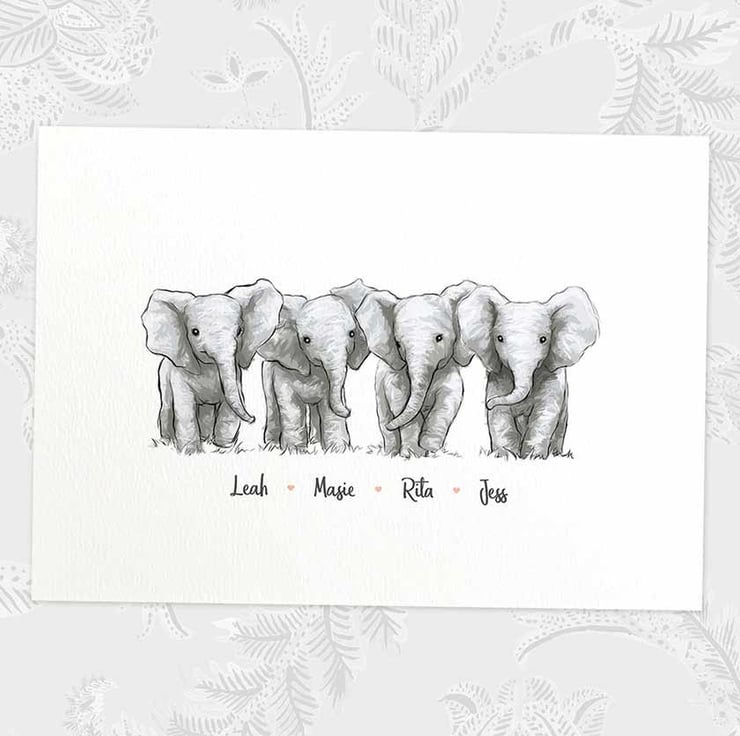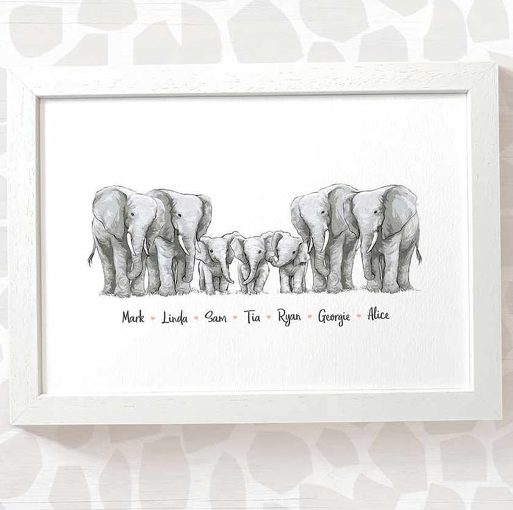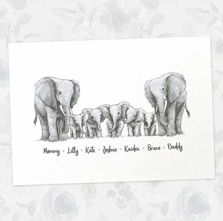 This personalised family portrait showcases an adorable elephant family and can be customised to include any number of adults and children, with an optional title at the top and names below. Simply provide your details in the personalisation box when placing your order, and we’ll create your one-of-a-kind design. For an extra special touch, you can request different sizes for the children—just include their ages, and we'll use them as a guide.