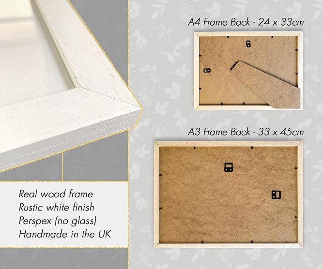 Framed prints include a charming white wooden frame that enhances the natural wood grain, complete with a shatterproof acrylic (safety perspex) window for extra durability.