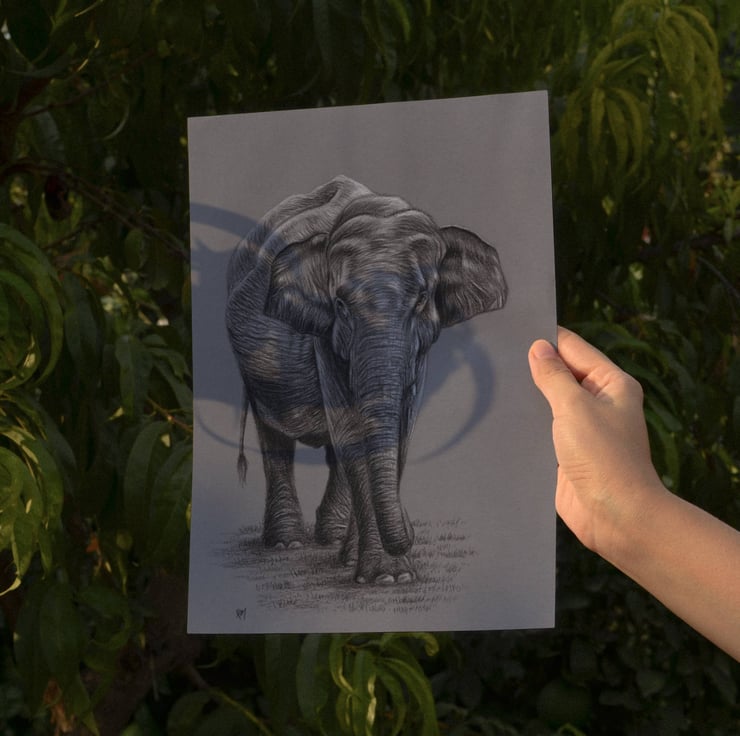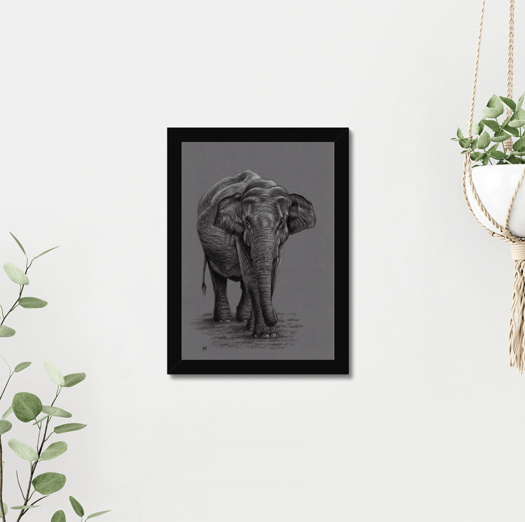 An original work of art. A unique gift for any animal lover. This is a charcoal drawing of an elephant on grey toned paper.