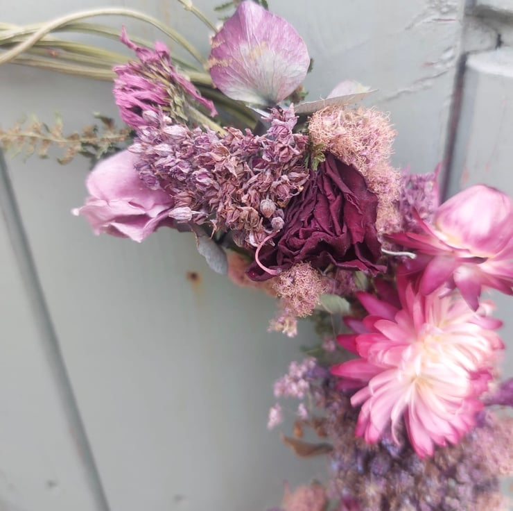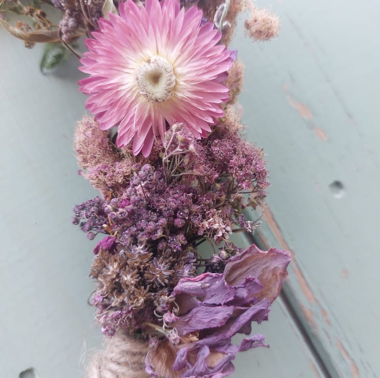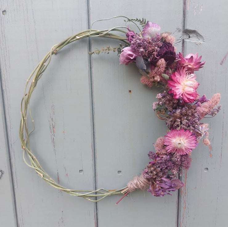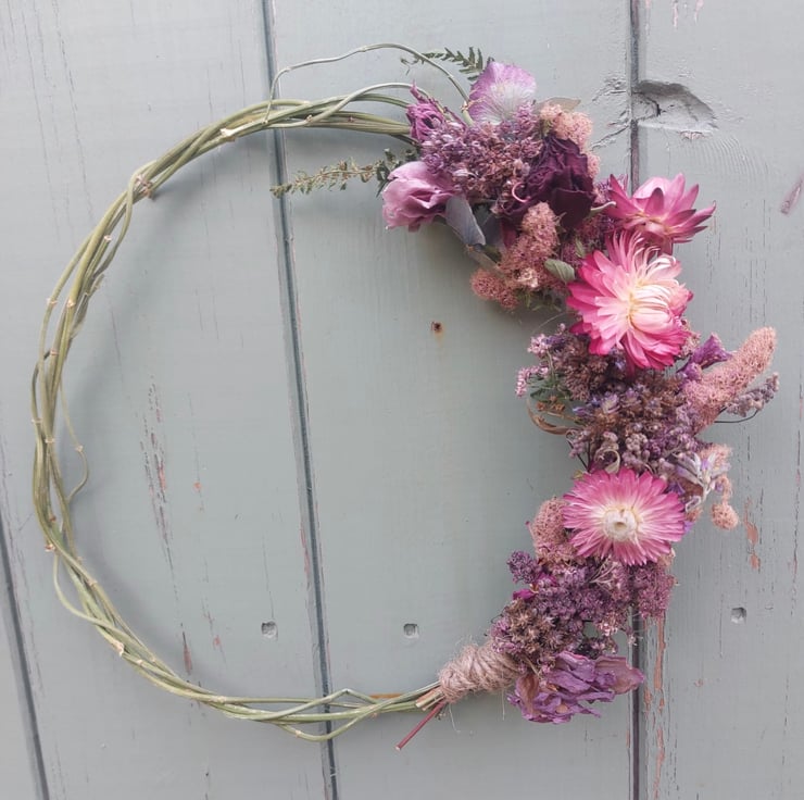 A handmade dried flower wreath measuring approximately 22cm at it’s widest points.