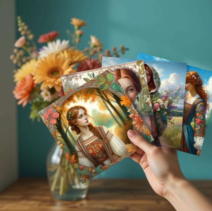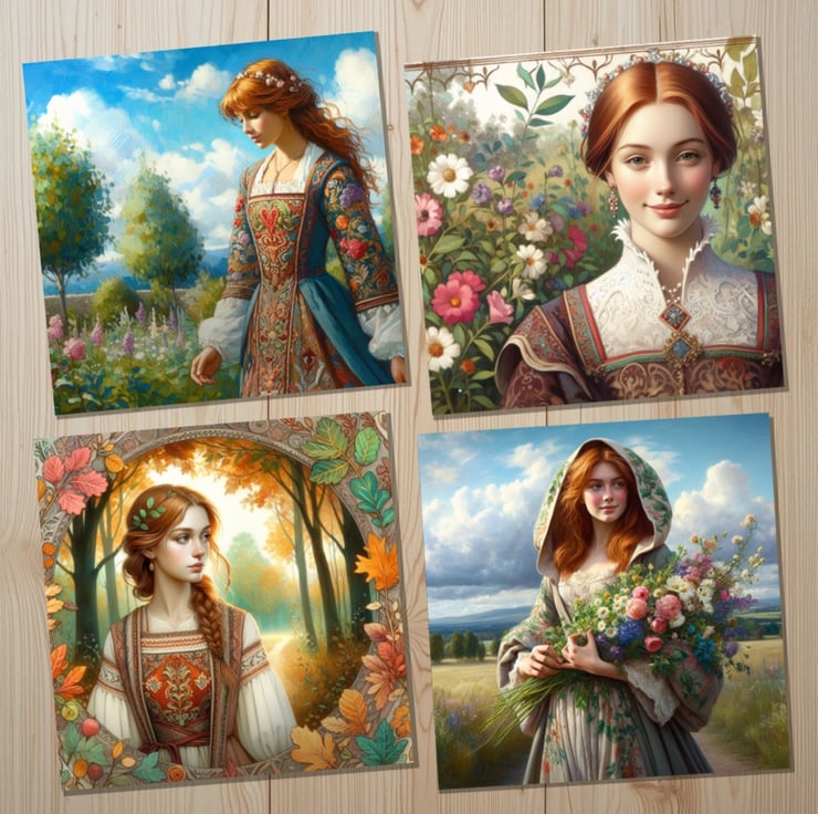 A collection of four 148mm square cards depicting a pre-raphaelite style beauty. Each card has been professionally printed on FSC registered cardstock. Cards come with complementary kraft envelopes.