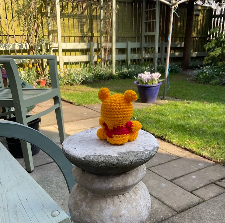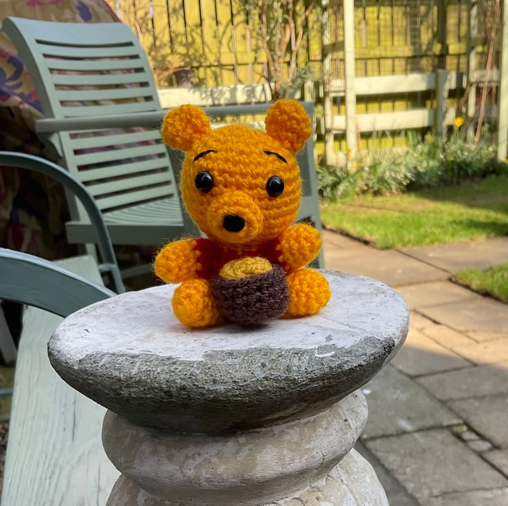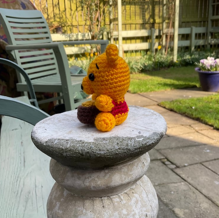 Handmade, crocheted Pooh Bear complete with hunny pot.