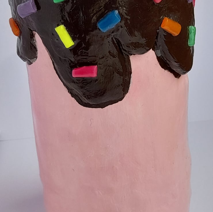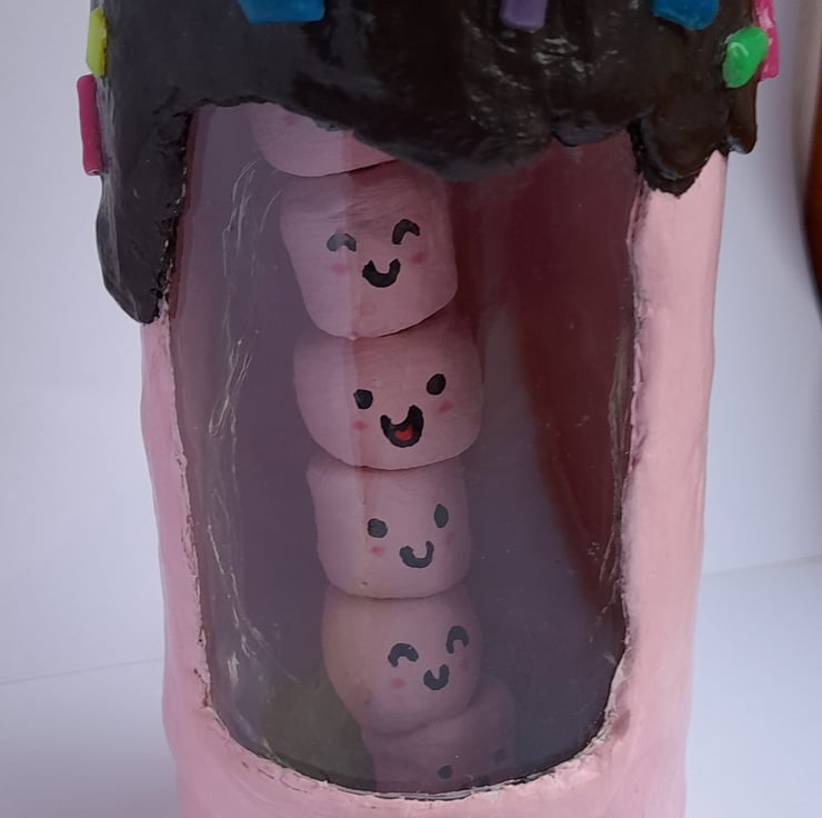 They are encased by a pink marshmallow outer layer topped with chocolate icing and multicoloured sprinkles.